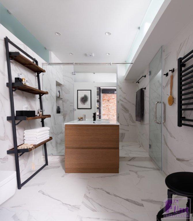 Кирпич — один из ключевых атрибутов стиля лофт. Он прекрасно сочетается с деревом и металлом. Поэтому при разработке дизайн-проекта специалисты предложили Максиму и Марии массу оригинальных решений для интерьера. Среди них можно назвать открытую лестницу на второй этаж с деревянными ступенями и тонкими перилами с деревянными рейками, а также простую, но лаконичную мебель без излишнего отвлекающего декора. Оттенки мрамора, которые прослеживаются в отделочных материалах и всевозможных предметах обихода, включая картины, дополнены в интерьере открытыми металлическими стеллажами, идеально подходящими для прохождения солнечного света даже в самые дальние уголки квартиры, что в сочетании с витражным остеклением помогло создать потрясающий эффект.