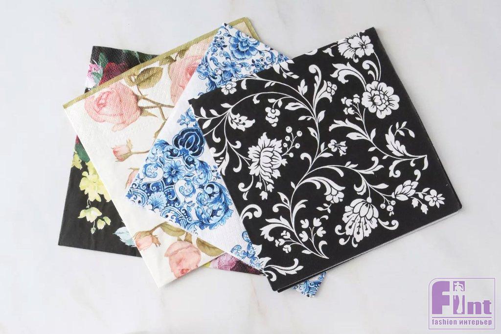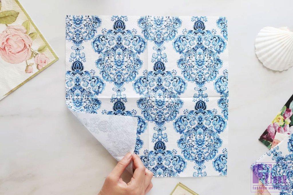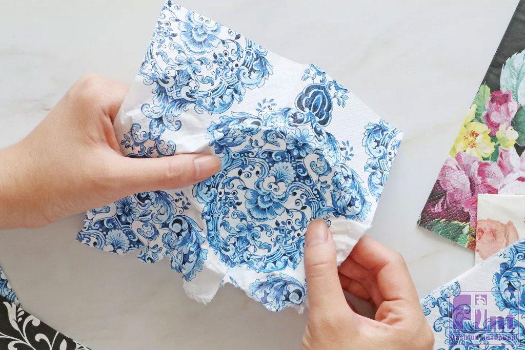 Чтобы приготовить салфетку, полностью разверните её, чтобы получился один большой квадратный лист. Если к обратной стороне прикреплен белый слой, разделите салфетку по слоям. Для сегодняшнего мастер-класса вам понадобится только самый верхний слой с нанесённым изображением. Самые обычные бумажные салфетки идеально подходят для декупажа, потому что они тонкие и с ними легко работать. Но также вы можете использовать и специальные салфетки для декупажа, которые вы без труда найдёте в любом магазине товаров для рукоделия.