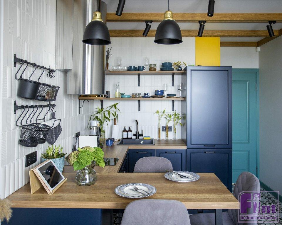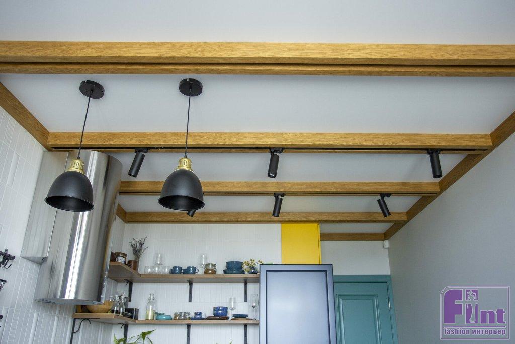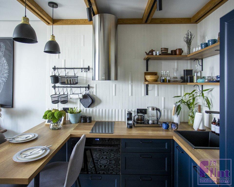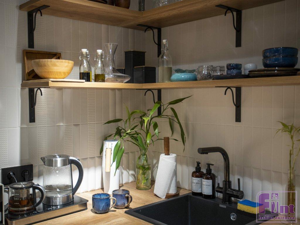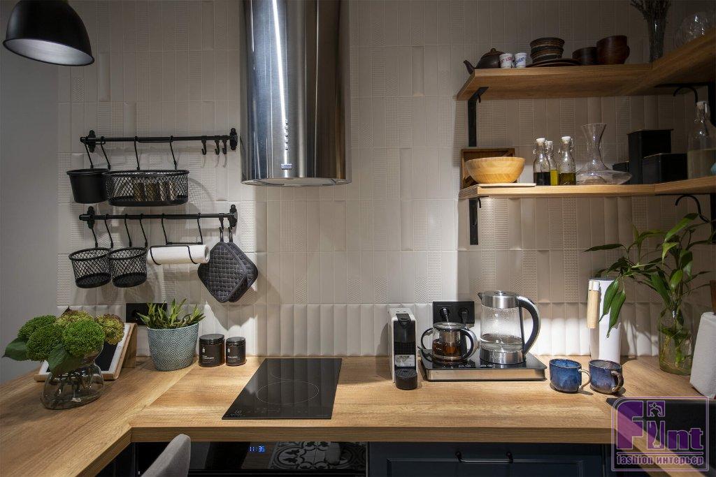 Фартук кухонного гарнитура выложили из необычной керамической плитки с разной формой поверхности. По периметру столешницы пустили декор округлой формы, тем самым объединив обе стороны. На стене, где расположена вытяжка и нет полок, сделали микс из остальных декоров на фоне базовой плитки этой коллекции. Также базовой плиткой выложили стену фартука с полками. На потолке сделали деревянные балки, в которые встроили шины для светильников.