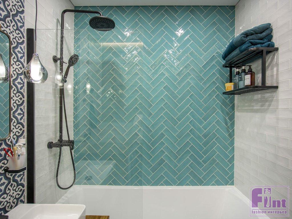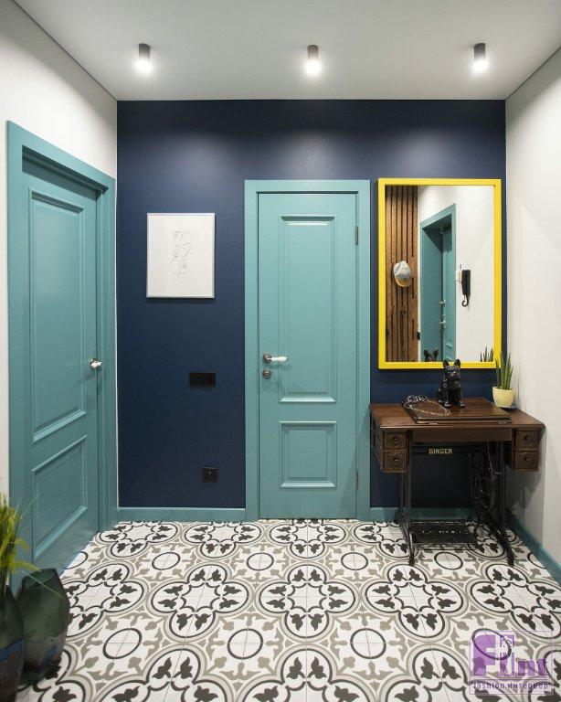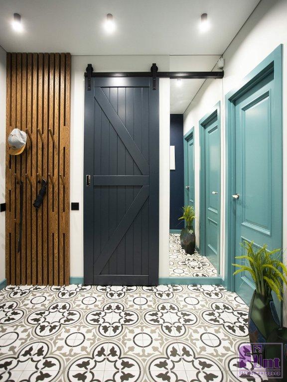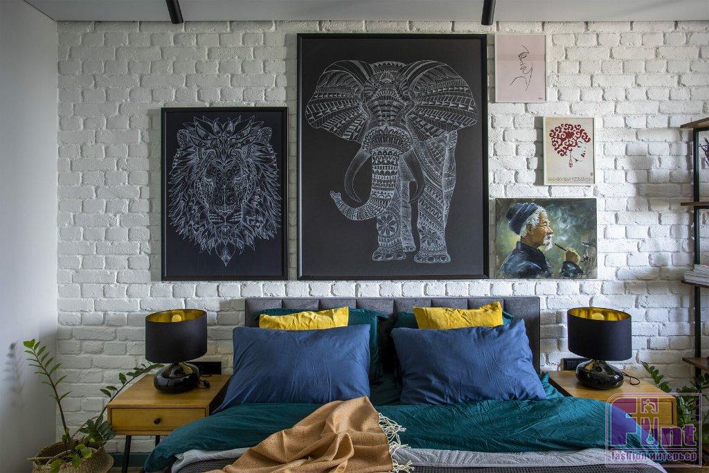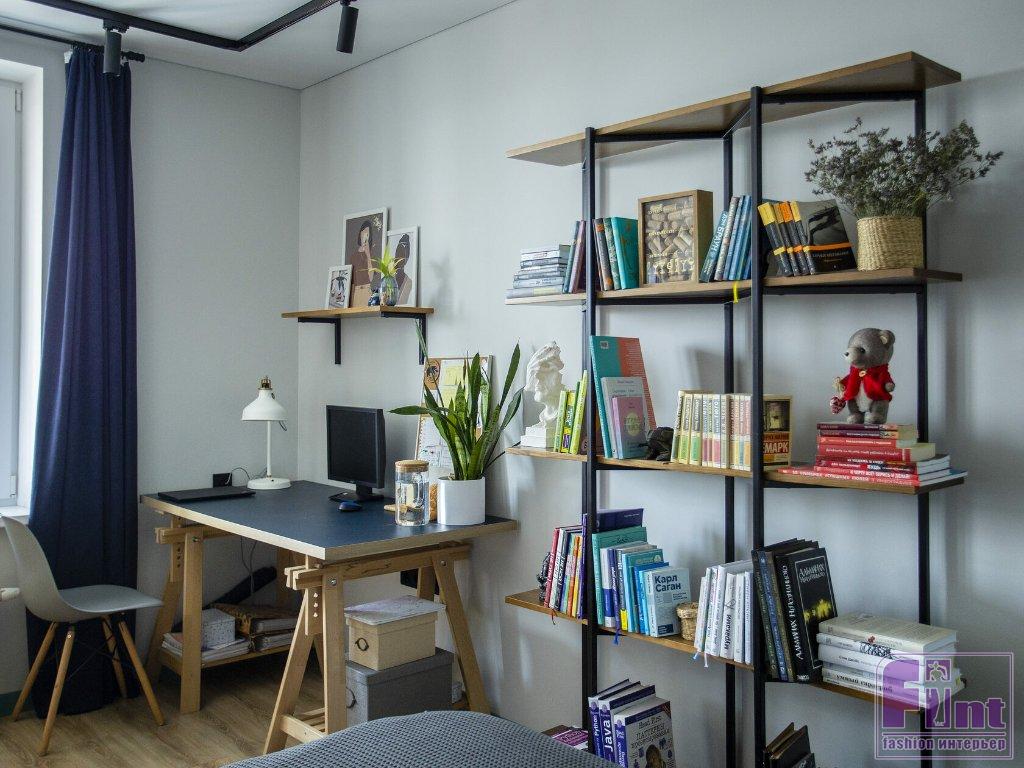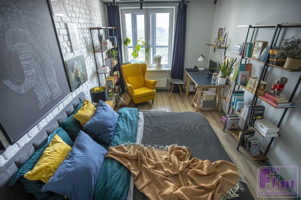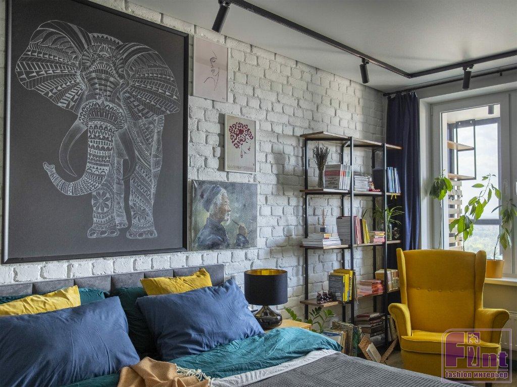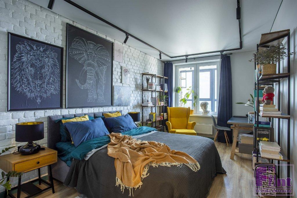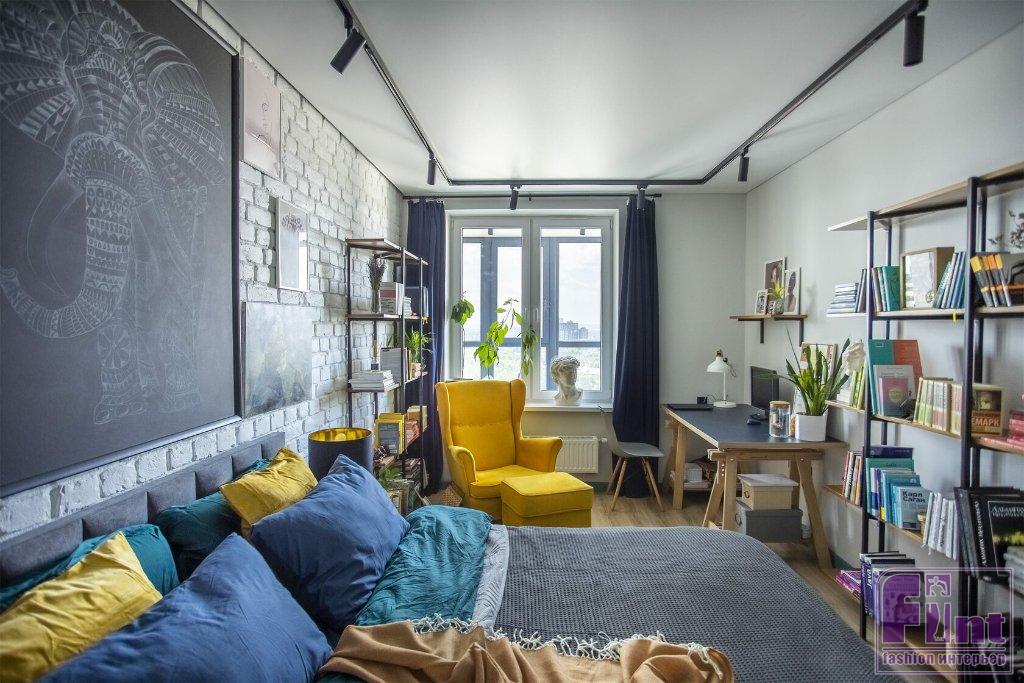В спальне хватило места не только для большой кровати, но и для рабочего стола и кресла для чтения. Одну из стен оформили декоративным кирпичом, покрашенным в белый цвет. На его фоне отлично смотрятся картины и минималистские стеллажи с открытыми полками. В прихожей сделали декоративную реечную панель из шпонированного МДФ с выдвижными крючками для повседневной одежды. Дверь в гардероб амбарного дизайна в синем цвете. Таким же цветом выкрашена стена, смежная с ванной комнатой.