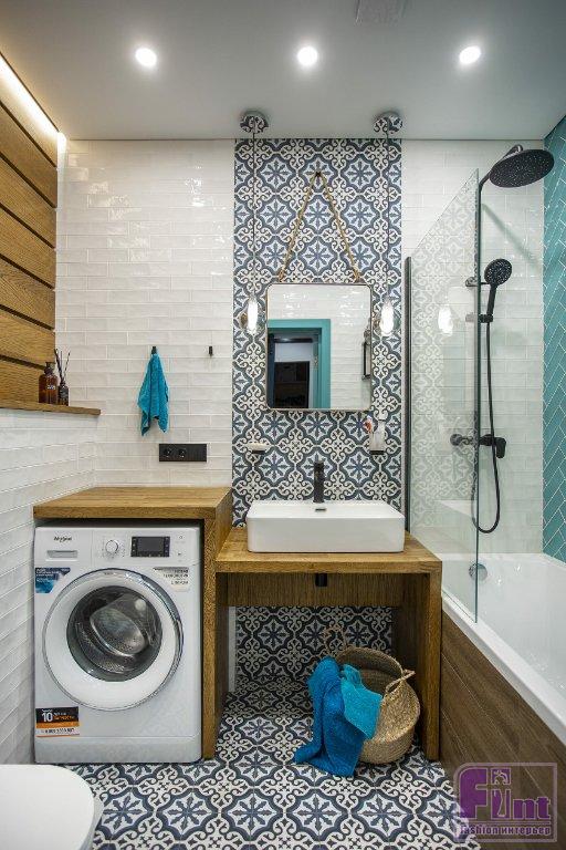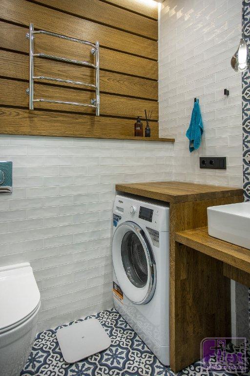 Планировка санузла довольно стандартная. Раковину сделали накладную, а стиральную машину, наоборот, разместили под столешницей. На стенах использовали комбинацию трёх видов плитки, обыграв тем самым зону умывальника и зону ванной. Консоль под раковиной выполнена из массива дуба, декоративная панель над инсталляцией из шпонированного МДФ.