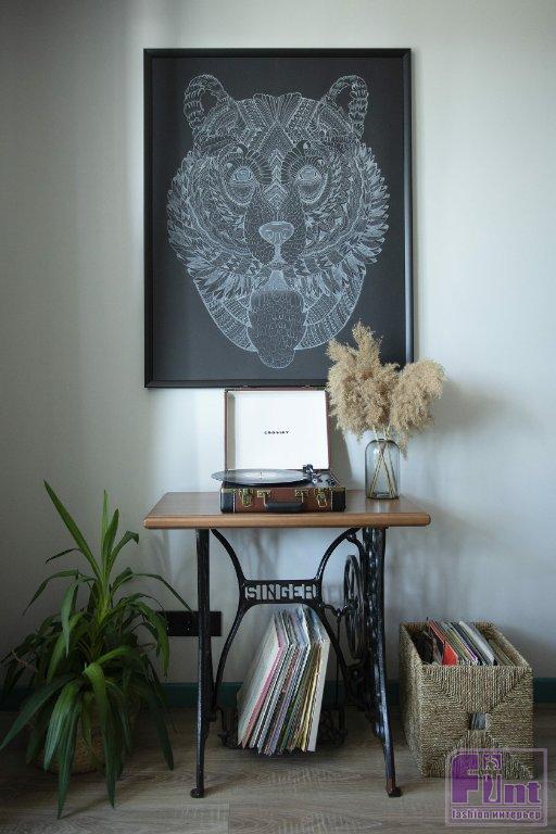 Одной из задач было вписать в интерьер имеющиеся у заказчиков картины и две чугунные рамы от старинных швейных машинок SINGER. Одну раму использовали в прихожей в качестве консоли, сохранив аутентичную столешницу с выдвижными ящичками, вторую — в гостиной, обновив деревянную плоскость рамы. Основную часть картин разместили в изголовье кровати на акцентной кирпичной стене, одну — в гостиной.