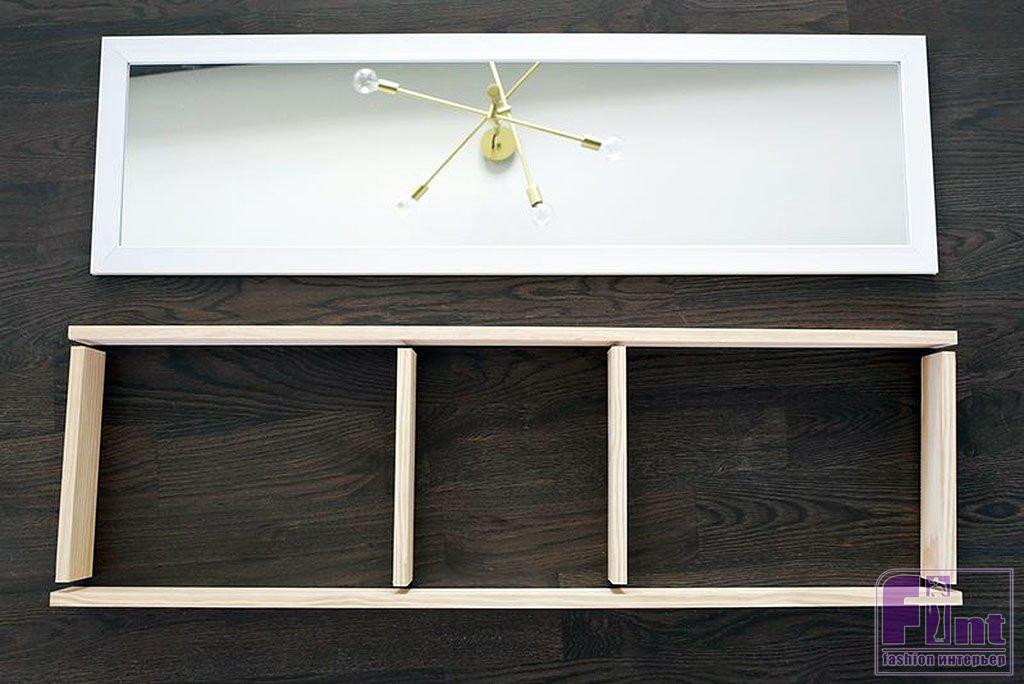 Итак, по сути, нам необходимо сделать раму точно такого же размера, как и у вашего зеркала. И зеркало будет служить дверцей для полок внутри рамы. Вы можете либо распилить древесину в магазине товаров для дома, либо воспользоваться подходящим ручным или электрическим инструментом. Отрежьте от доски две заготовки, которые точно соответствуют длине вашего зеркала. Затем отрежьте четыре заготовки, которые будут точно соответствовать ширине вашего зеркала, если поместить их между двумя длинными досками. Таким образом, если ваша древесина также имеет толщину 1,5 см, ваш размер короткой доски будет равен ширине зеркала минус 3 см, что суммарно равно толщине двух боковых досок в раме. Ещё две короткие доски будут располагаться сверху и снизу, чтобы завершить вашу раму, а две другие можно разместить в любом месте между ними, чтобы разделить пространство на три области. Если вам нужно больше полок, просто нарежьте больше коротких досок.
