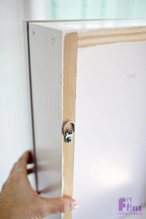 Для подвешивания вашего секретного шкафчика установите два крепления для картин с D-образным кольцом на задней стороне деревянной рамы примерно в 10 сантиметрах от верхней части рамы.