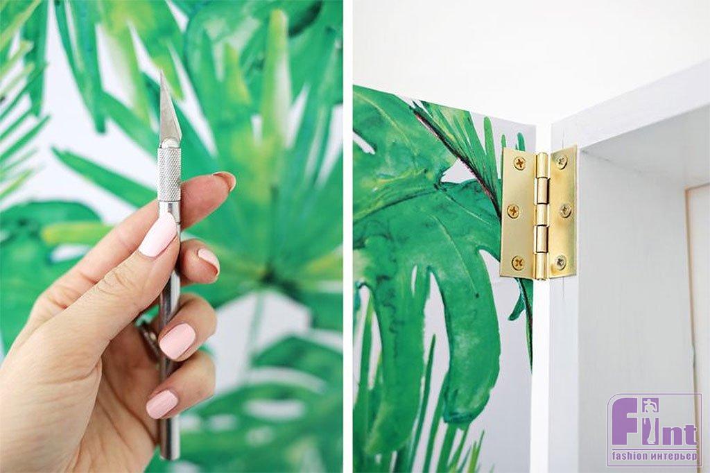 Чтобы придать вашему шкафчику для хранения украшений больше индивидуальности, оклейте заднюю часть зеркала самоклеящейся бумагой с красивым рисунком. Используйте острый ремесленный нож, чтобы вырезать места вокруг петель и обрезать самоклеящуюся бумагу по периметру зеркала.