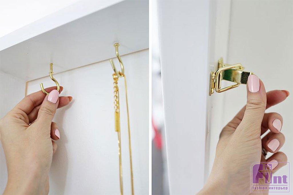 После того как ваш шкафчик займёт своё место на стене, вы можете установить декоративные шурупы с крючками на концах на каждую полку и установить защёлку сбоку, чтобы зеркальная дверца оставалась плотно закрытой. Повесьте все свои украшения на новые крючки, разместите другие украшения на полочках внутри шкафа и наслаждайтесь вашим новым предметом интерьера, сделанным своими руками!