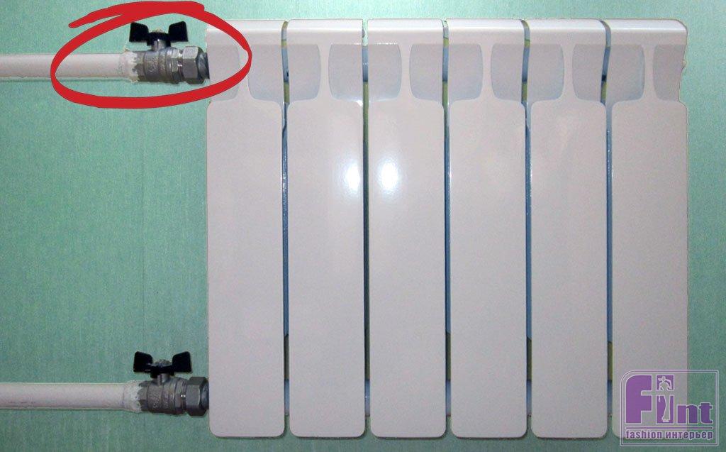В этом случае перед тем, как вы начнёте спускать воздух через клапан Маевского, вам необходимо перекрыть верхний запорный кран на батарее. То есть тот кран, через который вода подаётся в радиатор. Нижний кран, через который вода уходит обратно в стояк, закрывать не нужно.