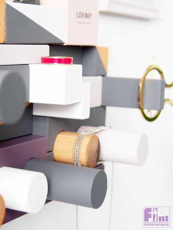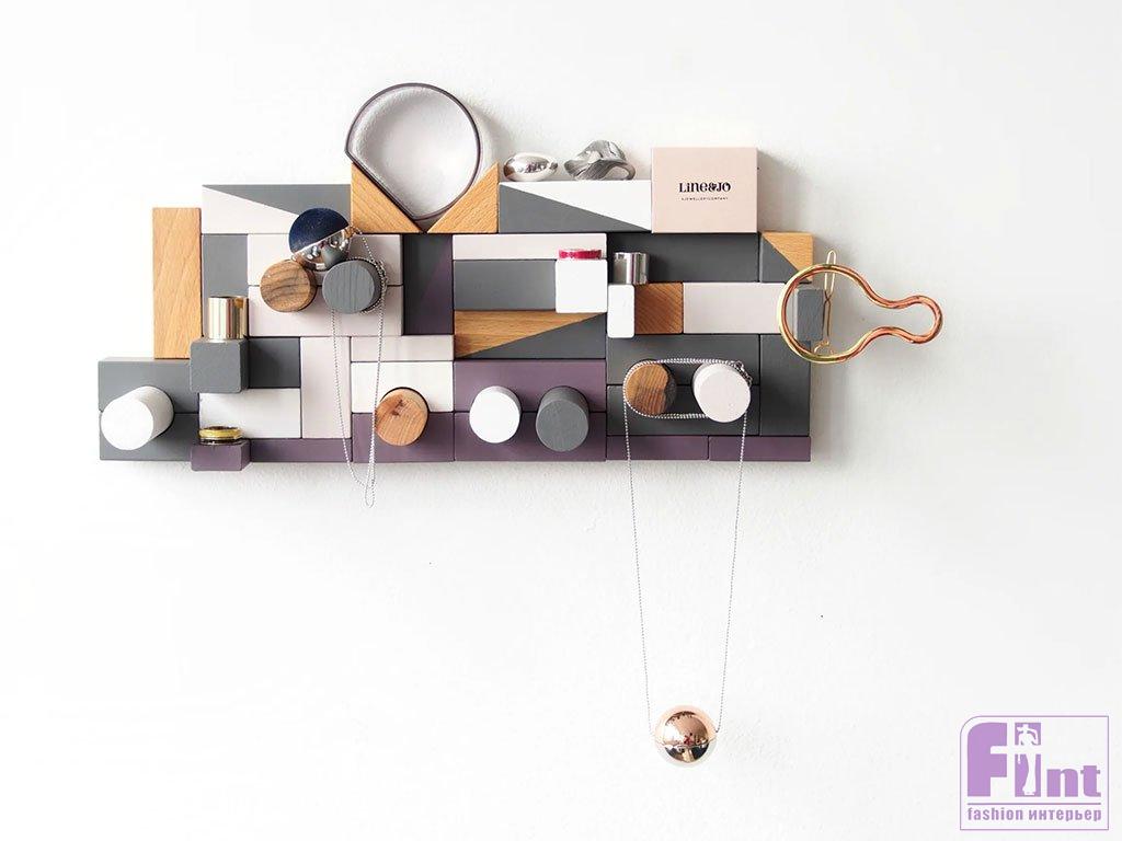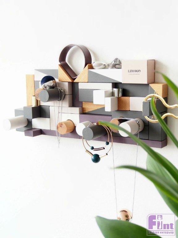 Наверняка у многих из вас в детстве одной из любимых игрушек был строительный конструктор из дерева. Его простые по форме блоки превращались по воле вашей фантазии в сказочные замки, неприступные крепости и таинственные сооружения далёкого будущего. Сегодня мы предлагаем вам вернуться в детство и вновь поиграть с любимым конструктором. Но в этот раз мы создадим из его блоков не замок или крепость, а потрясающий настенный органайзер-вешалку в очень популярном стиле мемфис.