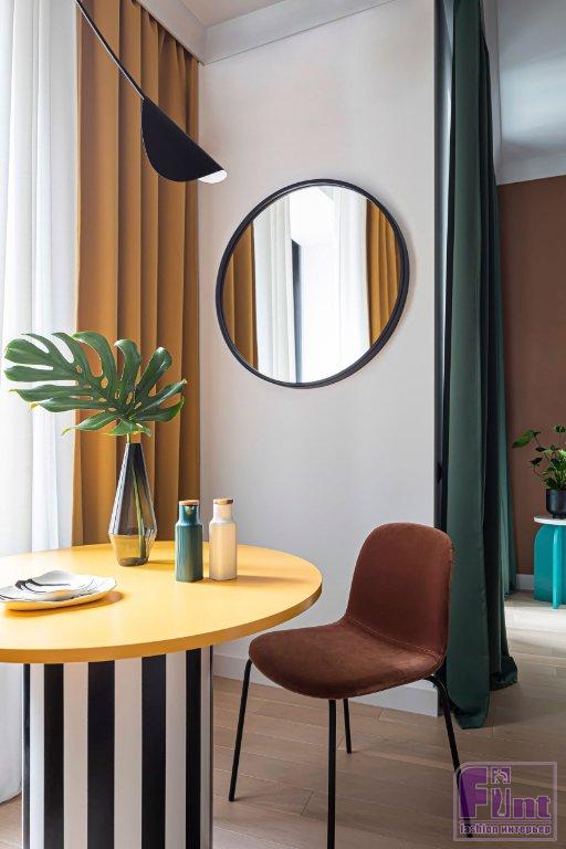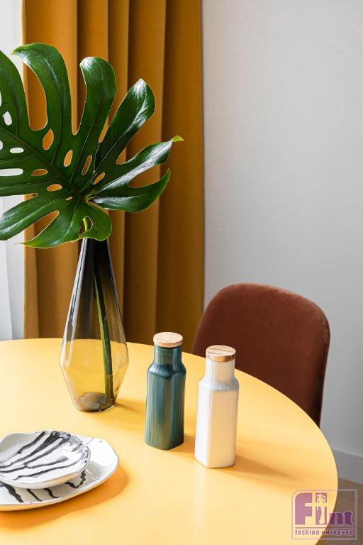 В интерьере дизайнер использовала приём колорблокинг, поэтому основная отделка — краска. В зоне прихожей на полу — керамогранит с принтом терраццо, это одна из отличительных особенностей стиля нео-мемфис. В жилых зонах квартиры использовали инженерную доску. Одной из акцентных зон квартиры является столовая, где размещён эффектный обеденный стол с опорой в чёрно-белую полоску. Кстати, чёрно-белая полоска — также отличительная особенность этого стиля.