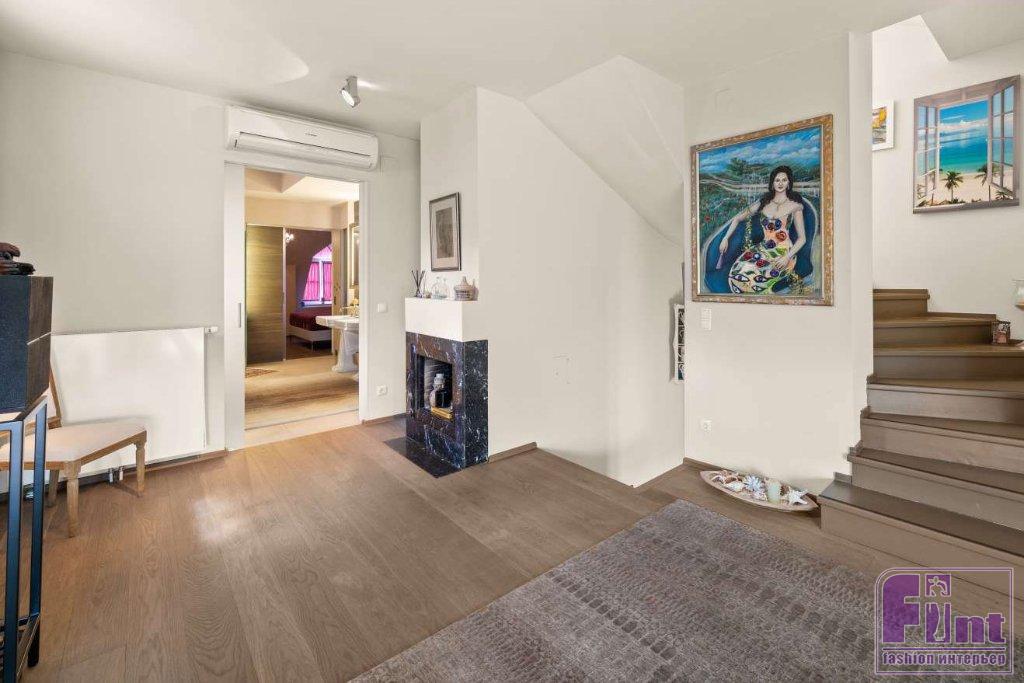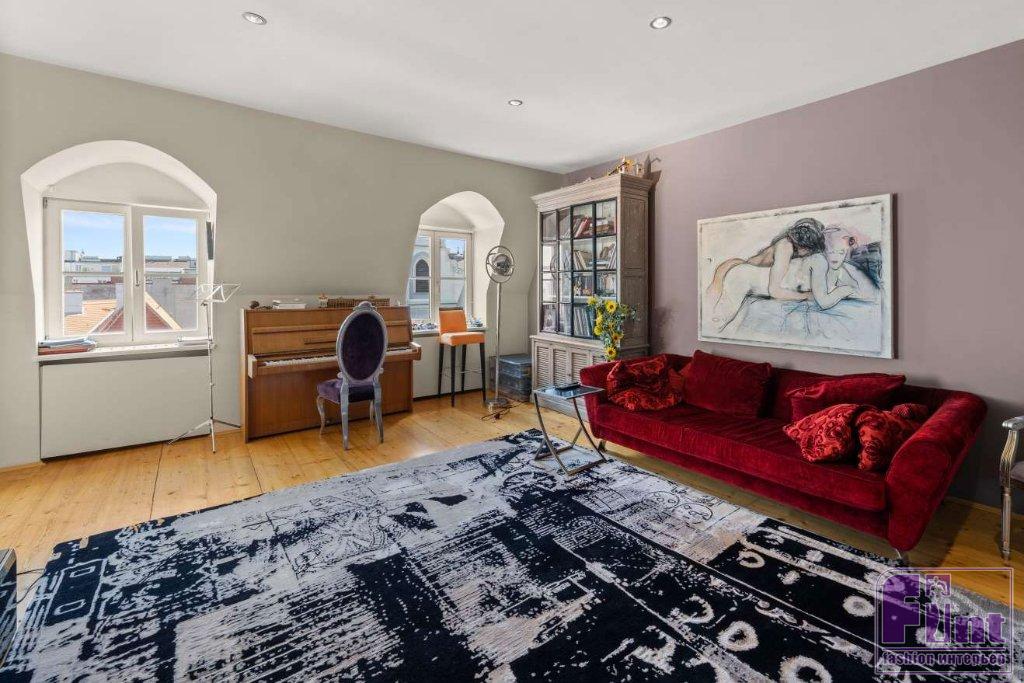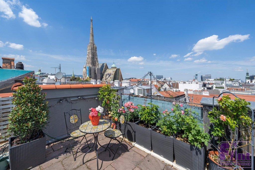 Дом, в котором продается квартира, находится в самом центре Вены. Это историческое здание в стиле барокко. Пентхаус имеет два входа и занимает два этажа. На первом находятся две гостиные, большая кухня, прихожая, санузел, спальня с отдельными ванной и туалетом, а также гардеробная и две подсобные комнаты. Из больших панорамных окон гостиной открывается красивый вид на францисканскую церковь.