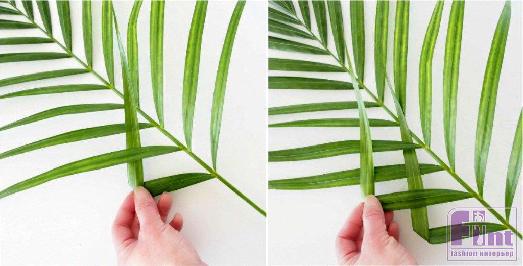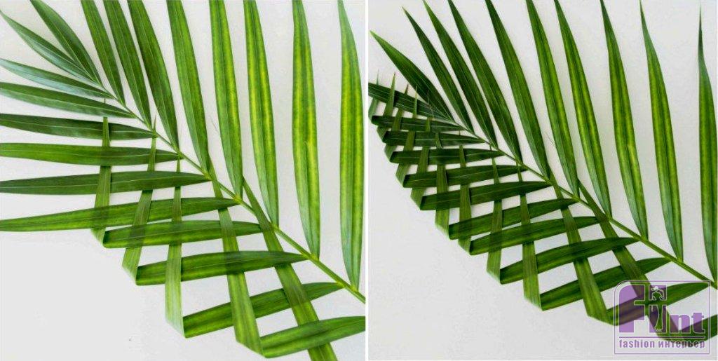 Начните плетение листьев на пальмовой ветке. Эта техника называется полотняным переплетением, при которой узкие полоски материала переплетаются в перпендикулярном направлении попеременно с другими пересекающими их полосками. Роль таких полосок в нашем мастер-классе будут играть тонкие листья пальмовой ветки. Начните с того, что сложите первый лист под углом 90 градусов и вплетите его в следующие листья.