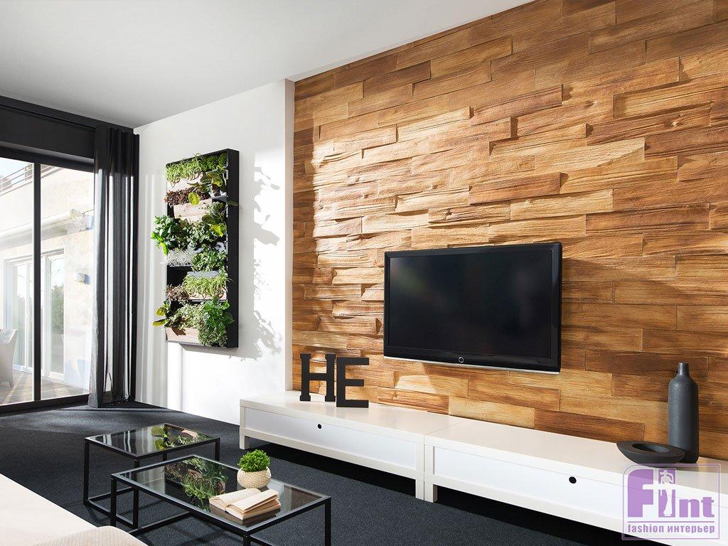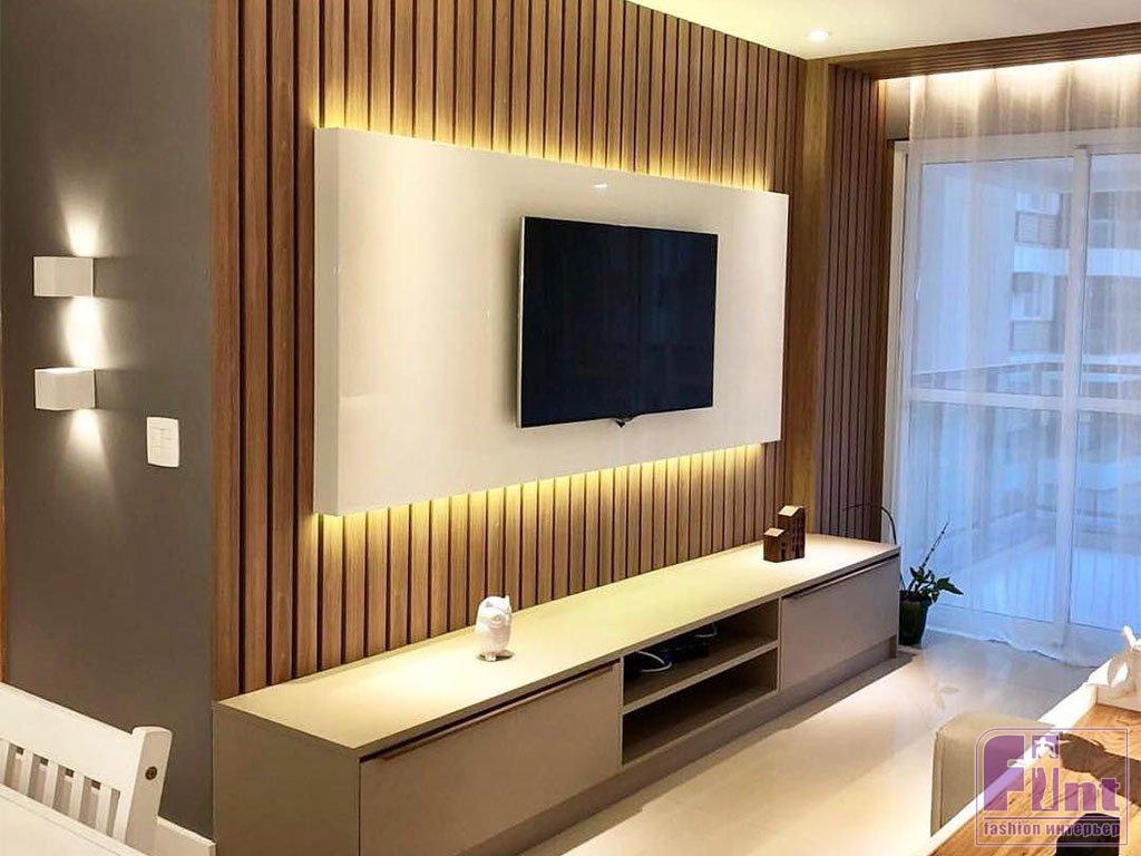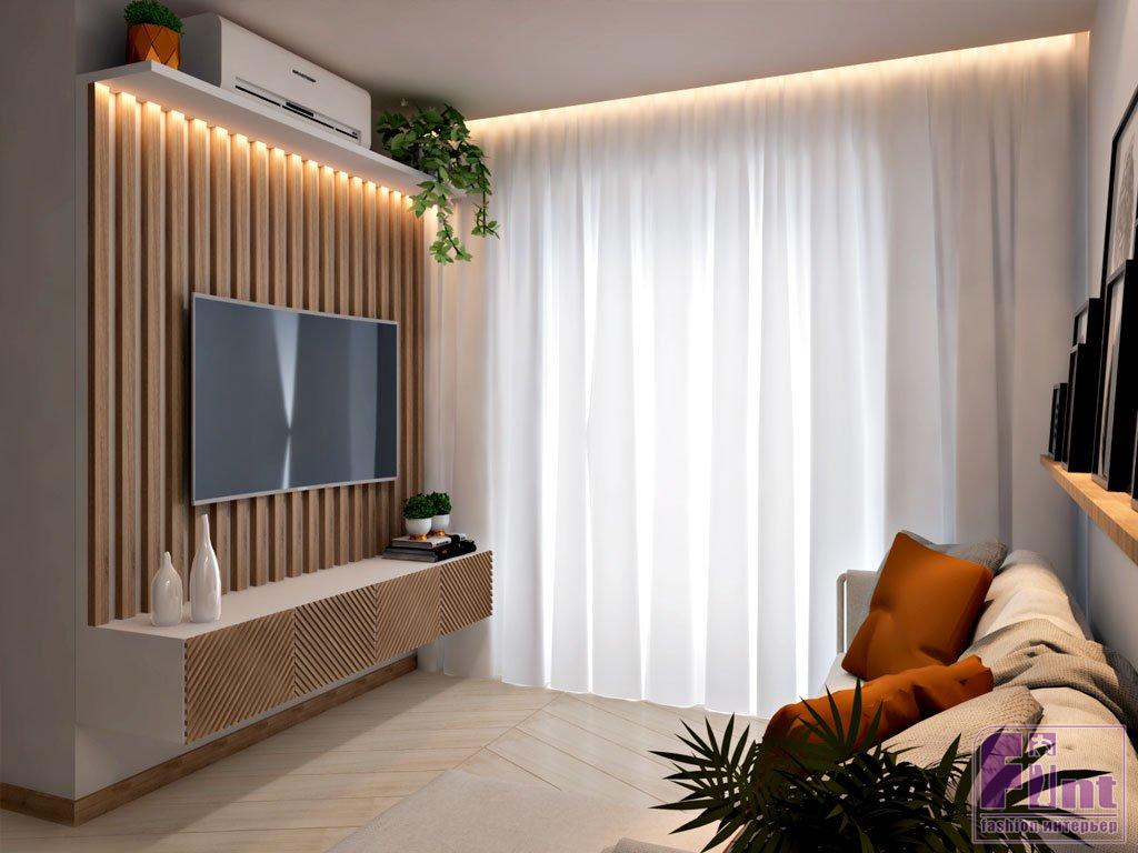 Чтобы чёрный прямоугольник телевизора выглядел на стене естественно, можно продолжить геометрическую тему и даже усилить её, оформив стену за телевизором тонкими рейками, расположенными вертикально. Такой орнамент «полоски» компенсирует горизонтальный прямоугольник телевизора, поможет визуально «приподнять» потолок и добавит вашему интерьеру лёгкую нотку эко стиля, благодаря использованию натурального дерева.