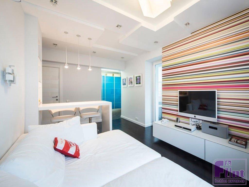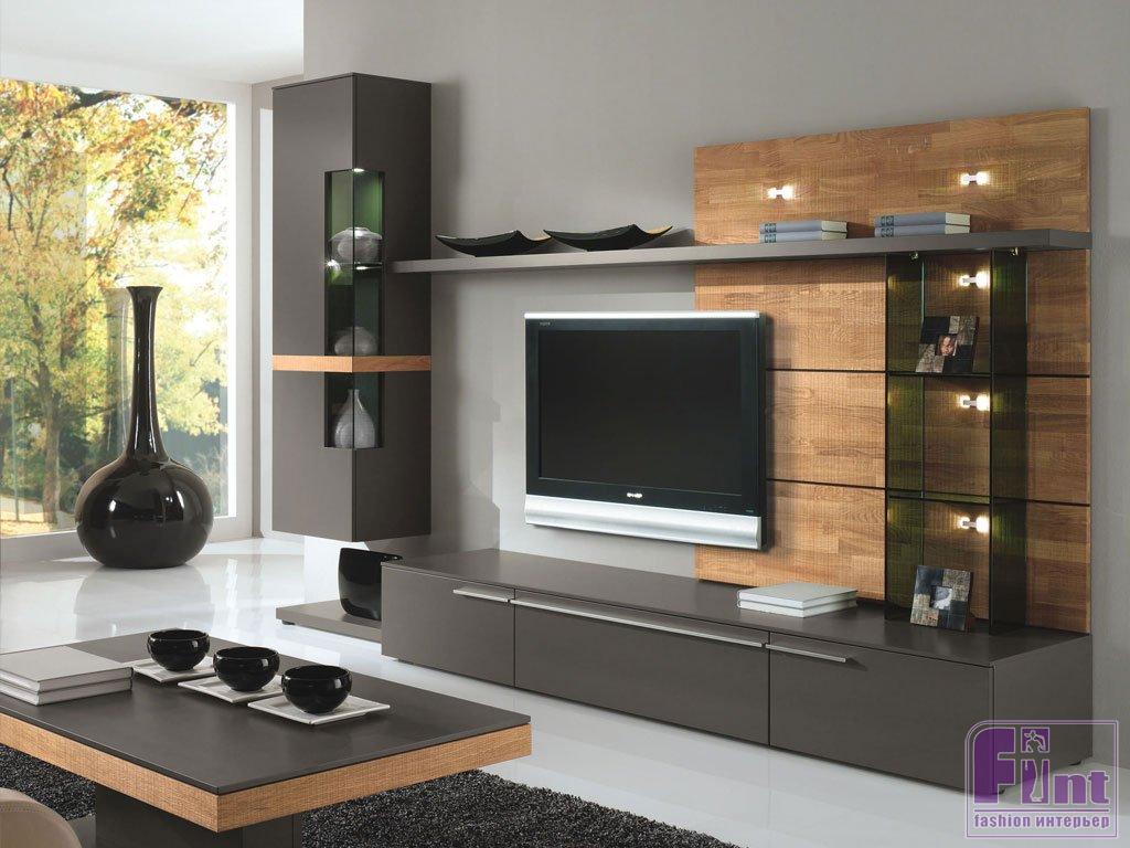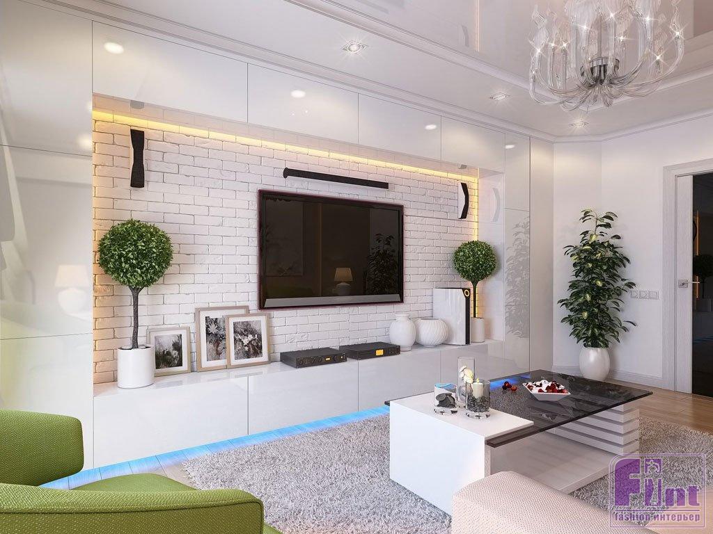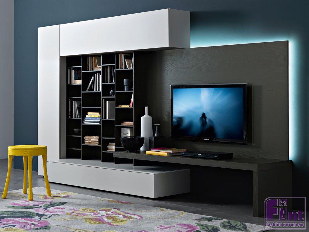 Разрушьте стереотипы и сделайте мебельное оформление стены с телевизором в асимметричном формате! Можно даже попробовать использовать элементы конструкции от разных мебельных наборов, которые затем дополнить яркими аксессуарами. Такая асимметрия и лёгкий цветовой «шум» будет компенсировать телевизионную панель, забирая акцент внимания на себя.