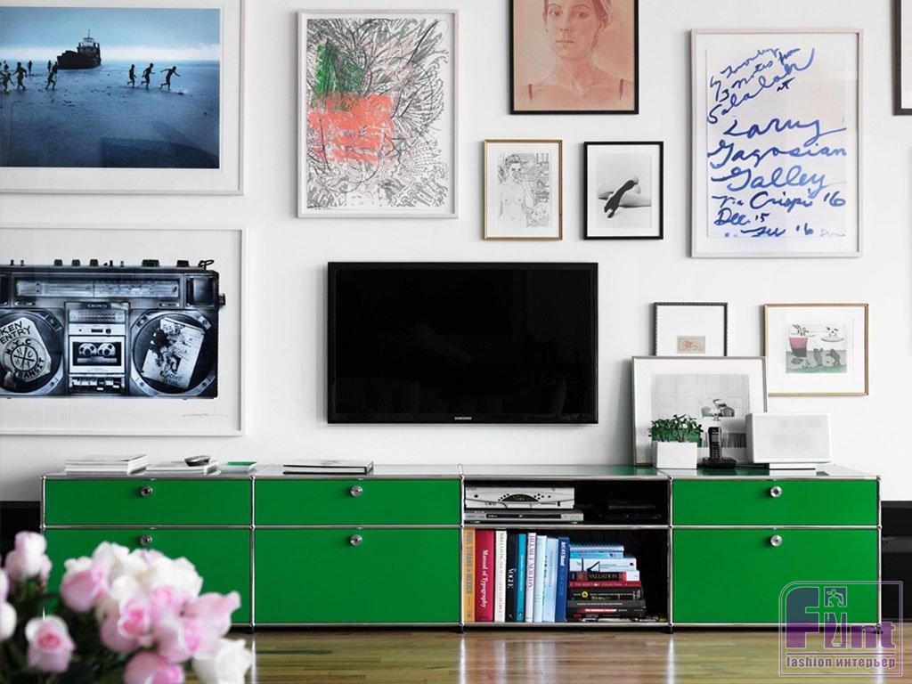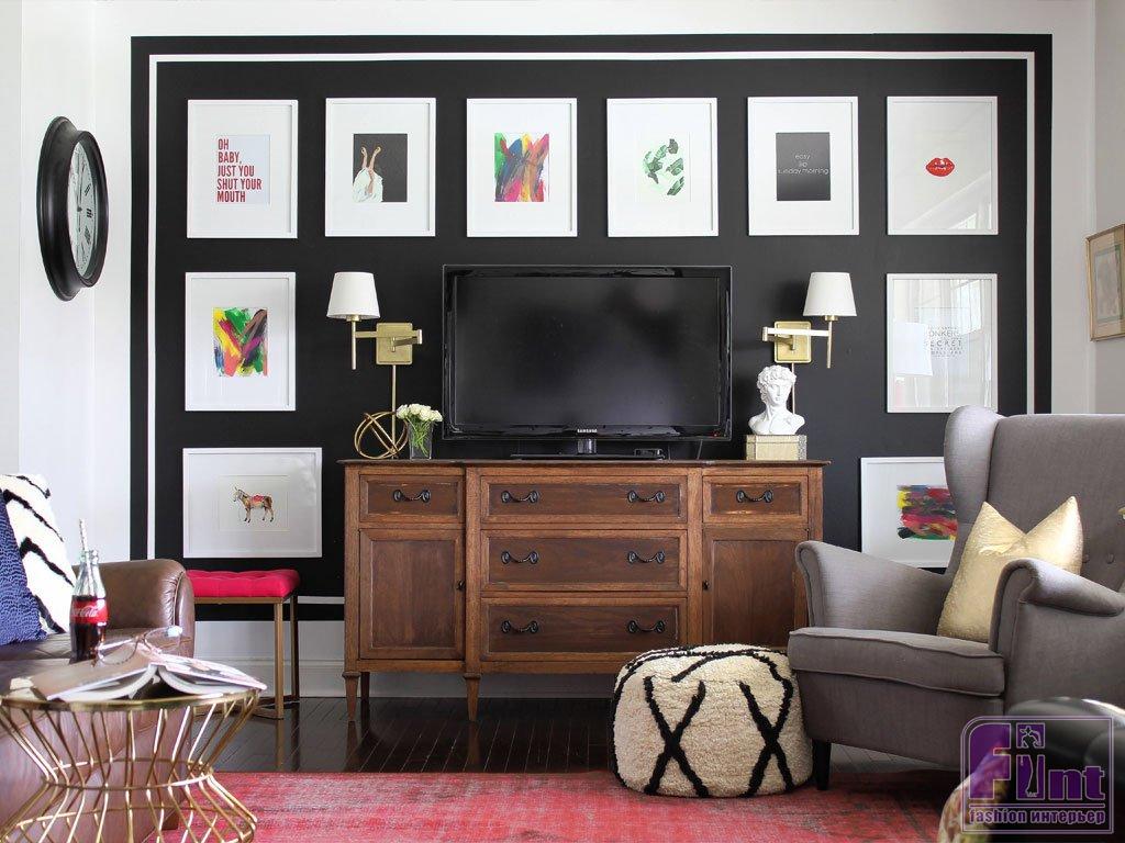 Развесьте вокруг телевизора картины, фотографии, постеры или стильные дизайнерские панно. Единственное условие – все элементы «свиты» не должны по своим размерам превышать размер телевизора. Гармоничное заполнение пространства стены с телевизором таким декором – это отличная идея, поскольку она очень простая и вполне бюджетная. Кстати, если вы решили использовать для оформления стены картины в рамах, телевизионную панель также можно оформить в красивый багет!