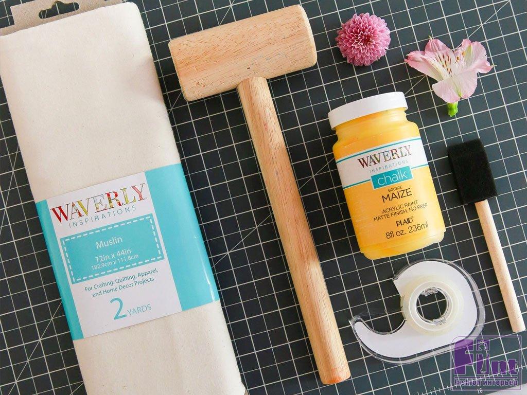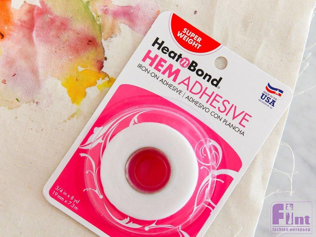 Подверните ткань с четырёх сторон, зафиксировав подгиб при помощи клеевой ленты и утюга. Безусловно, края можно также подшить на швейной машинке, но использование клеевой ленты позволяет сделать этот процесс быстрее и проще. Затем отпилите от деревянной рейки два одинаковых отрезка, соответствующие ширине вашего отрезка ткани с подгибами.