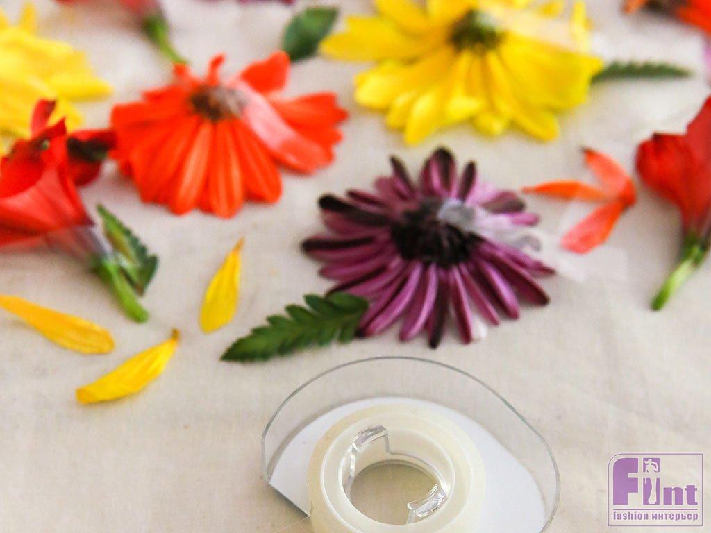 Разложите бутоны цветов в нужном вам порядке. Не стесняйтесь использовать лепестки и листья в дополнение к бутонам. Помните о сочетании оттенков и не бойтесь их смешивать и комбинировать. Конечный результат будет более абстрактным по форме, но цвета будут относительно соответствовать самому цветку. Зафиксируйте бутоны, лепестки и листья на ткани при помощи узкого канцелярского скотча, а затем накройте поверхность листом пергаментной бумаги.