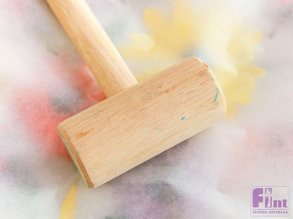 Поскольку вам потребуется наносить довольно сильные удары молотком, выберите прочную рабочую поверхность. Удары должны быть действительно сильные, чтобы максимально извлечь из растений их цветной «сок». Имейте в виду, что влага из бутонов и листьев также будет просачиваться сквозь ткань, поэтому вы можете подложить под ткань кусок картона.