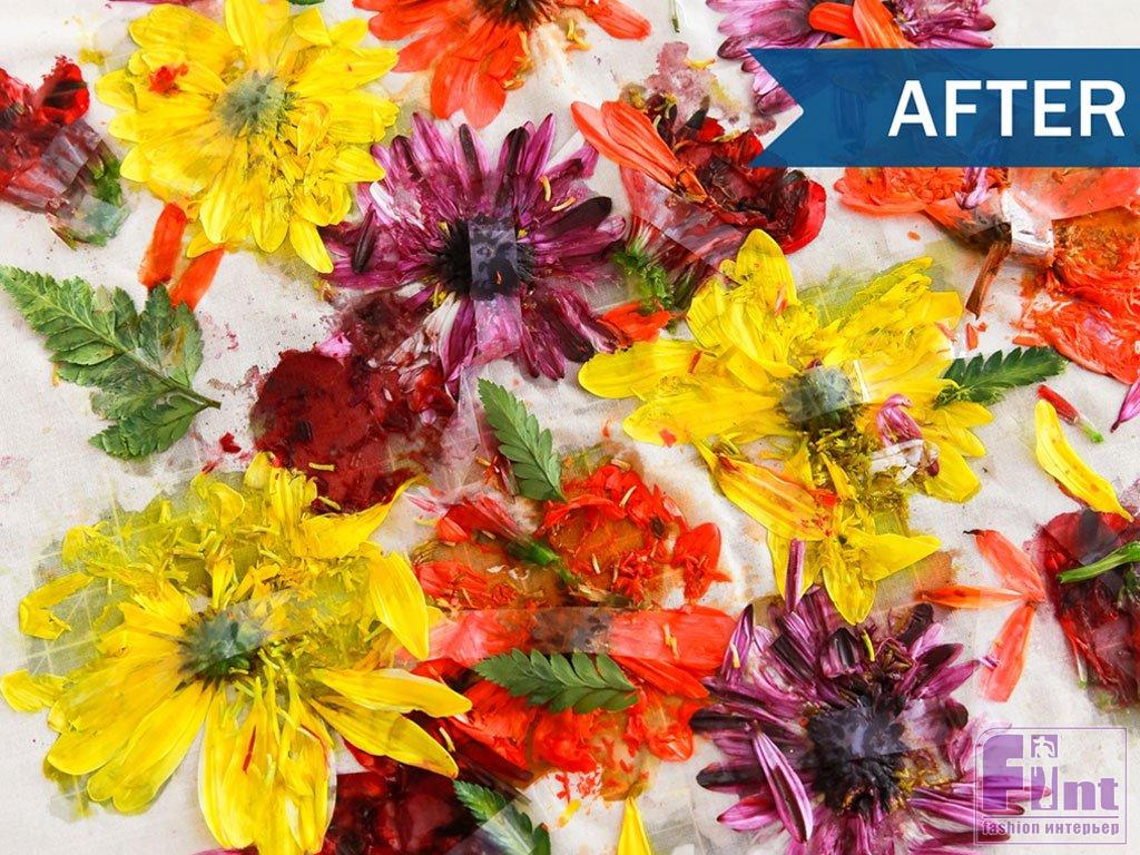Периодически проверяйте результат, приподнимая пергамент, чтобы убедиться, что все цветы достаточно хорошо были обработаны ударами молотка, чтобы отдать свой цвет ткани. После того как вы закончите «набивать» свой дизайн, удалите все бутоны и лепестки вместе с канцелярским скотчем. Дайте ткани высохнуть, прежде чем добавлять последние штрихи к вашему панно.
