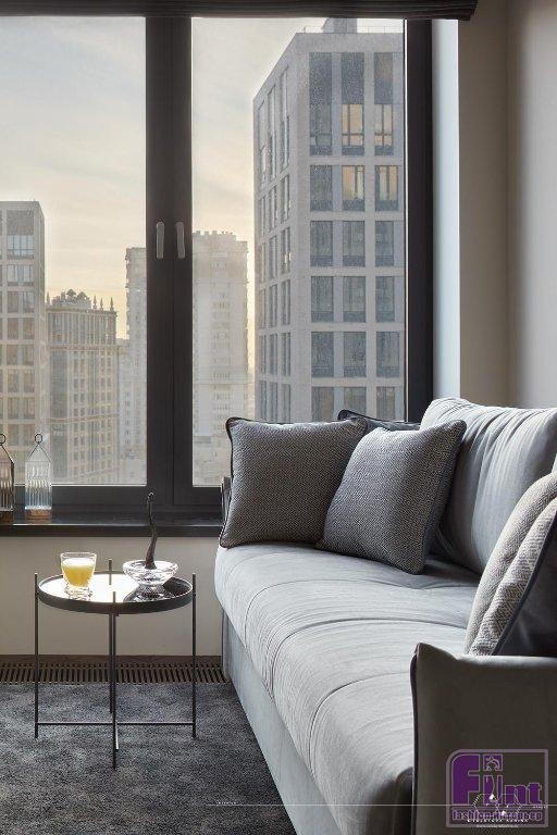 «Анна Королик обратилась ко мне с просьбой спроектировать для неё современный интерьер квартиры площадью 88.5 м². При первой же встрече на объекте я поняла для себя концепцию будущего проекта. Мне захотелось подчеркнуть ощущение простора, которое давали окна от пола до потолка, и статус квартиры, расположенной в жилом комплексе Vander Park», — рассказывает Карина.