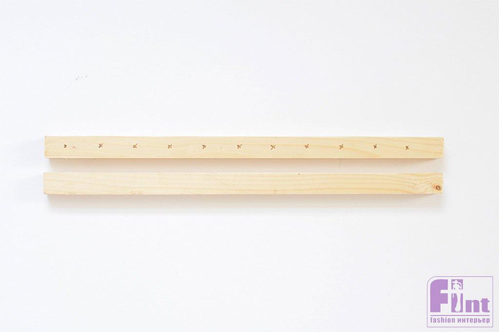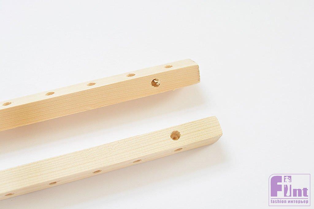 Отметьте ещё 4 отверстия на концах брусков примерно в 4 см от каждого из концов. Эти отверстия помогут нам соединить две заготовки в единую конструкцию, поэтому их нужно просверлить на двух брусках «зеркально»: справа относительно верхних отверстий на одном бруске, и слева – на втором.