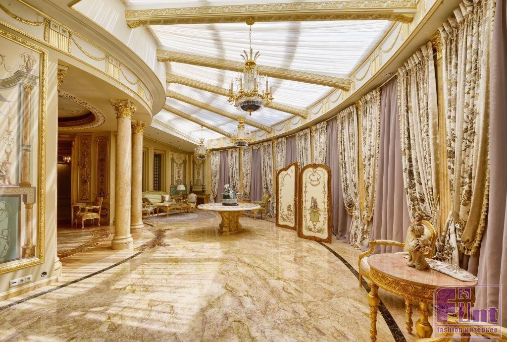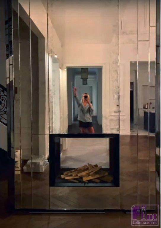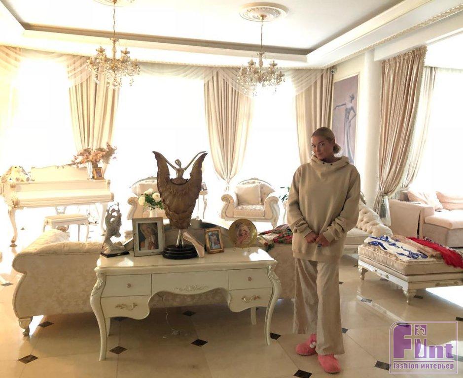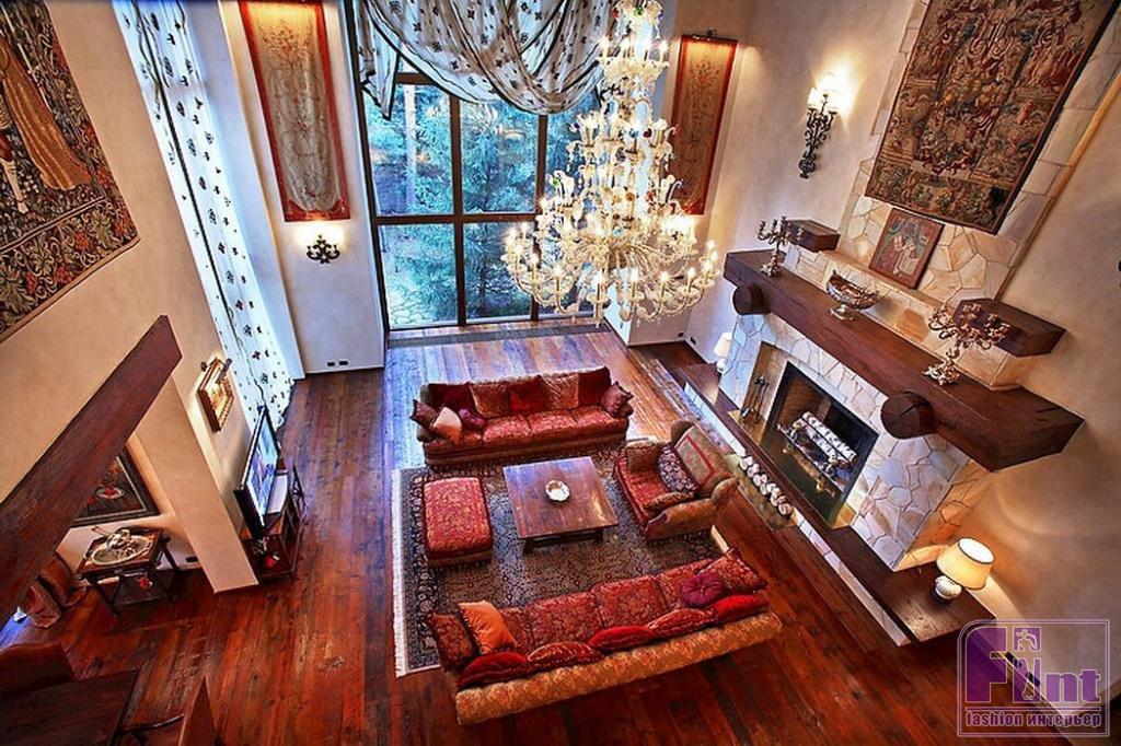 Огромный дом певицы, где для каждого члена семьи найдётся свой угол, строился три года. Над дизайном работали известные дизайнеры, и результат получился соответствующий. Входную зону, в которой расположено большое круглое зеркало в позолоченной раме, с гостиной разделяют белые двери со стеклянными вставками. Двусветная гостиная объединена со столовой и кухней. В этом большом, светом пространстве два «центра притяжения»: это, во-первых, оригинальная люстра в обеденной зоне, которую хозяйка дома вместе с дизайнером долго искали и выбирали, и, во-вторых, — зеркальный камин, скрывающий на самом деле две несущие колонны. Благодаря такому решению удалось не только спрятать несущие конструкции, но и визуально увеличить пространство гостиной. За камином находится лестница на второй этаж дома, где расположены приватные зоны.