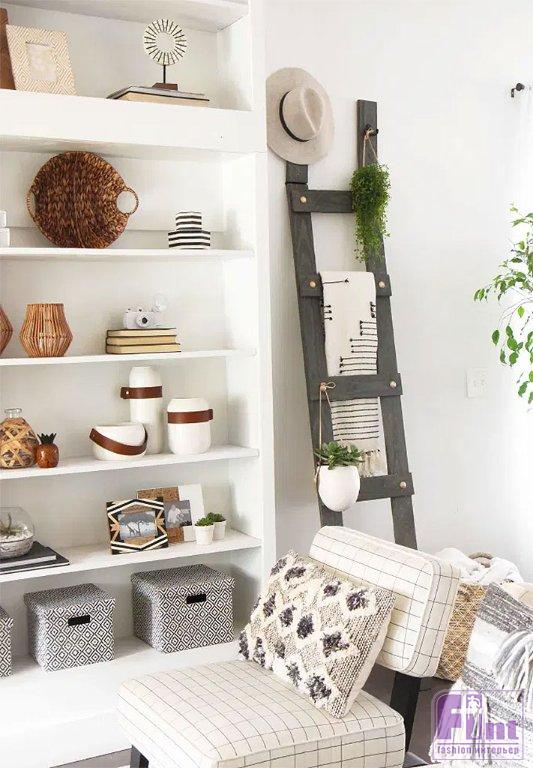 У всех этих лестниц есть один недостаток: будучи просто прислонёнными к стене, они не закрепляются, потому могут соскользнуть по гладкому полу и упасть. Особенно, если эти лестницы-вешалки дополнительно украшены тяжёлыми кашпо с домашними растениями. Сегодня мы расскажем, как сделать такую необычную вешалку с хитрым подвижным верхним сегментом, который можно легко закрепить на стене. Такая лестница никогда не упадёт, какие бы тяжёлые предметы на ней не были навешаны.