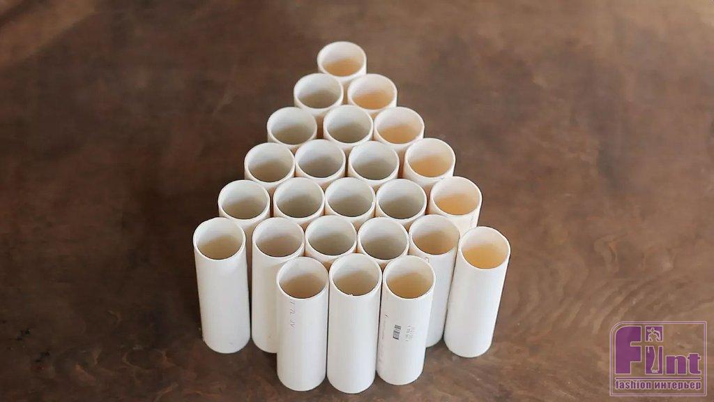 Расположите нарезанные куски трубы в форме дерева. Вот примерная схема, которую применили мы, начиная с нижней части «дерева», по рядам: 3 трубы, 6 труб, 5 труб, 4 трубы, 3 трубы, 2 трубы, 1 труба.