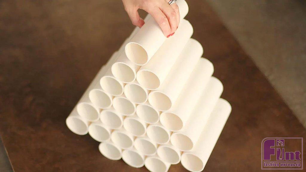 При помощи клеевого пистолета склейте сначала каждый отдельный ряд труб вместе. Затем сложите каждый ряд в виде дерева и горячим клеем соедините ряды вместе.