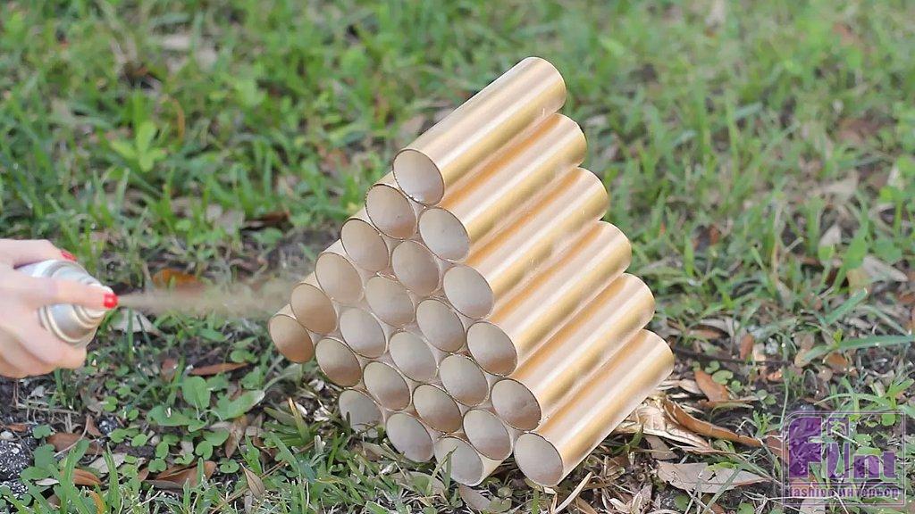 Окрасьте заготовку аэрозольной краской. Мы использовали краску в цвете золотой металлик, чтобы добавить сочный позолоченный оттенок в наше изделие. Окраску труб лучше всего проводить на открытом воздухе, при необходимости используя средства индивидуальной защиты.