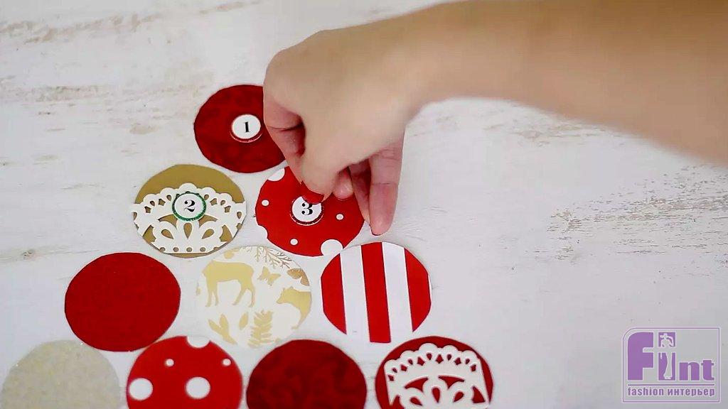 Разложите бумажные круги так, как вы планируете разместить их на «дереве» адвент-календаря, а затем приклейте наклейки с номерами дней на каждый круг. Вам нужно будет пронумеровать их от 1 до 24. Вы также можете просто напечатать кружочки с цифрами на принтере, если у вас под рукой нет никаких наклеек, или даже от руки написать цифры на вырезанных белых кружочках.