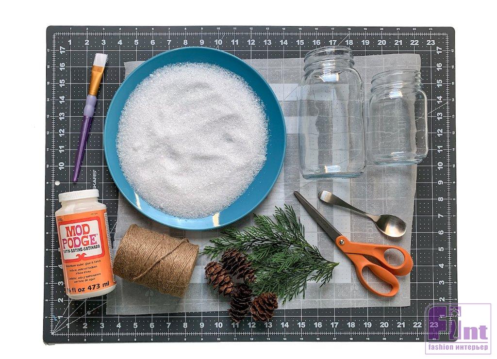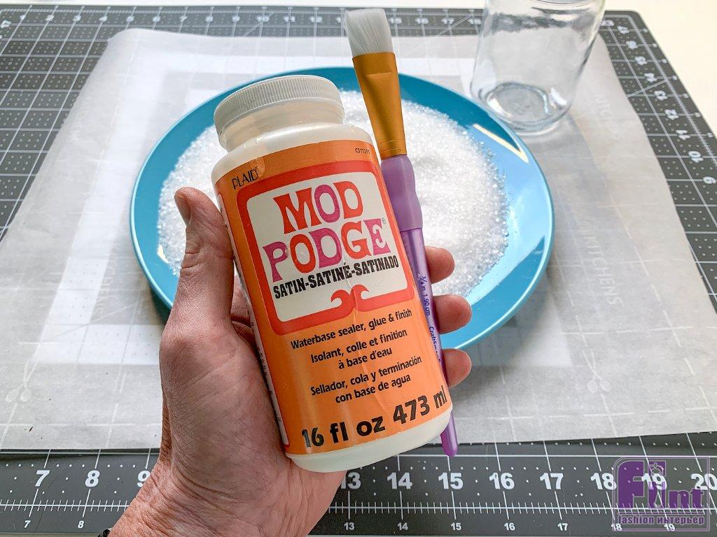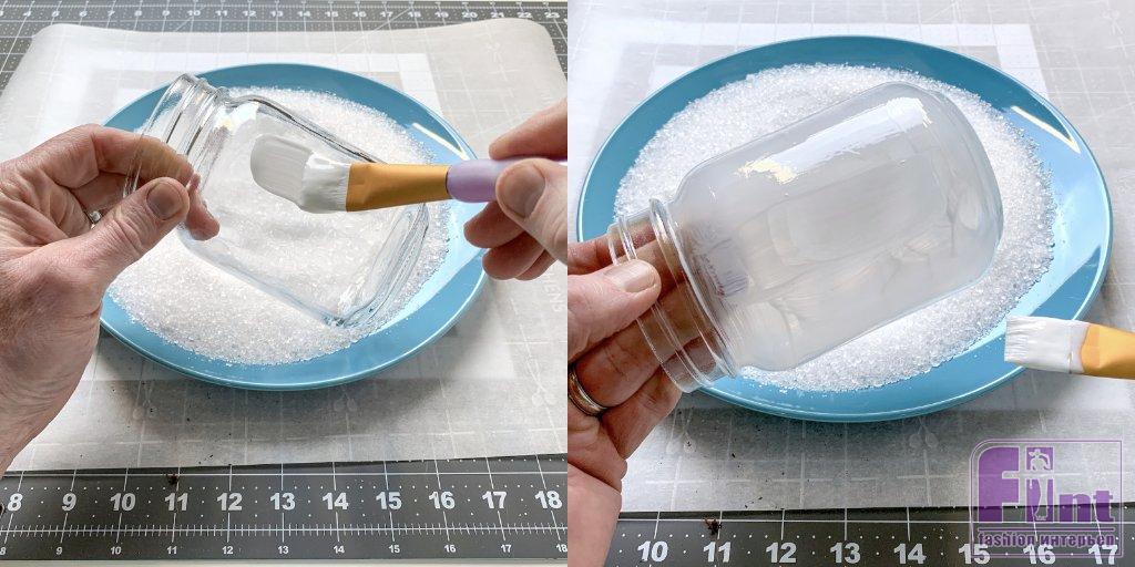 Нанесите клей-лак для декупажа слоем средней толщины на банку равномерными, быстрыми мазками. Необходимо работать быстро, поскольку клей-лак для декупажа довольно быстро сохнет. Повторное намазывание клея приведёт к тому, что банки будут покрыты неравномерным слоем соли, а это не очень эстетично. Важно покрыть всю банку клеем, чтобы слой соли, имитирующий снег, был однородным.
