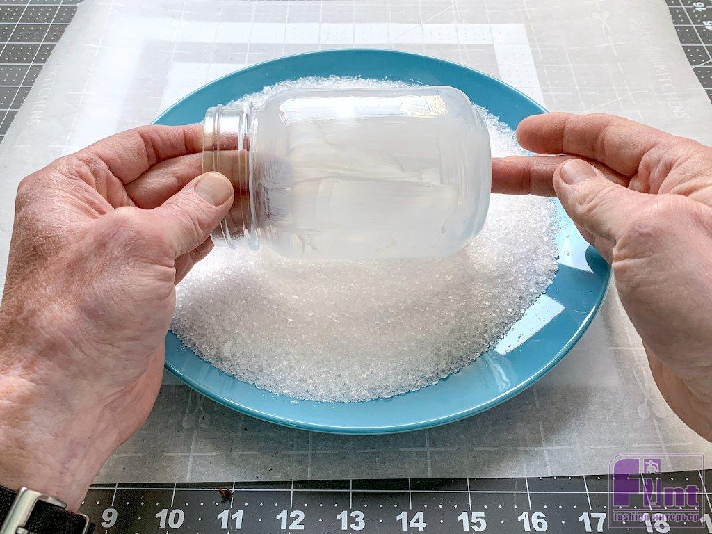 Обваляйте банку в соли со всех сторон, слегка надавливая на неё сверху. Достаньте банку из соли и, используя ложку, посыпьте солью те участки банки, на которые, возможно, соль не попала. Оставьте ваши баночки высыхать на несколько часов.
