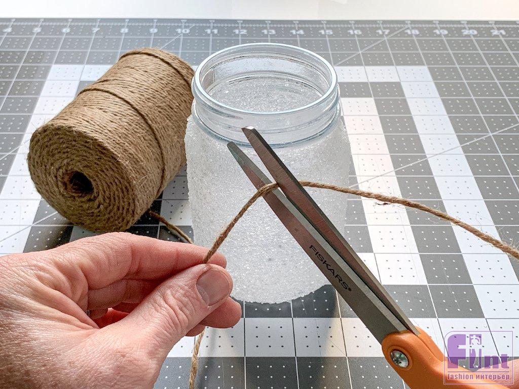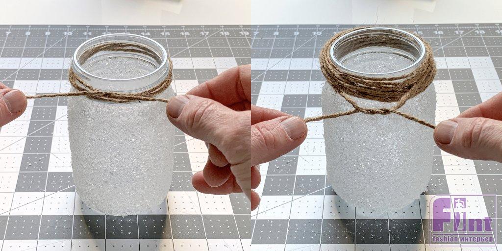 Отрежьте кусок шпагата, достаточный для того, чтобы обернуть его вокруг горлышка банки 6-7 раз. Начинайте оборачивать шпагат вокруг горлышка.