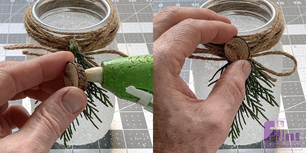 Используйте пистолет для горячего клея, чтобы прикрепить веточки туи к передней части ваших светильников. Затем положите поверх клея маленькие кусочки дерева, чтобы замаскировать место приклеивания.