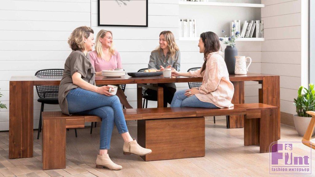 Стол трансформер может также использоваться на улице с помощью дополнительных деталей для Патио. Коллекция представляет собой многофункциональный, высококачественный и долговечный дизайн для мягких сидений и небольших поверхностей столов. Мебель буквально удваивается, благодаря встроенным стульям, спрятанным внутри каждого сиденья. Это означает, что набор может быть расширен с трех до пяти, с шести до 10 и с девяти до 15 посадочных мест.