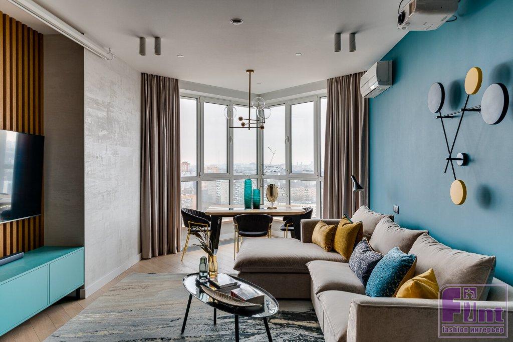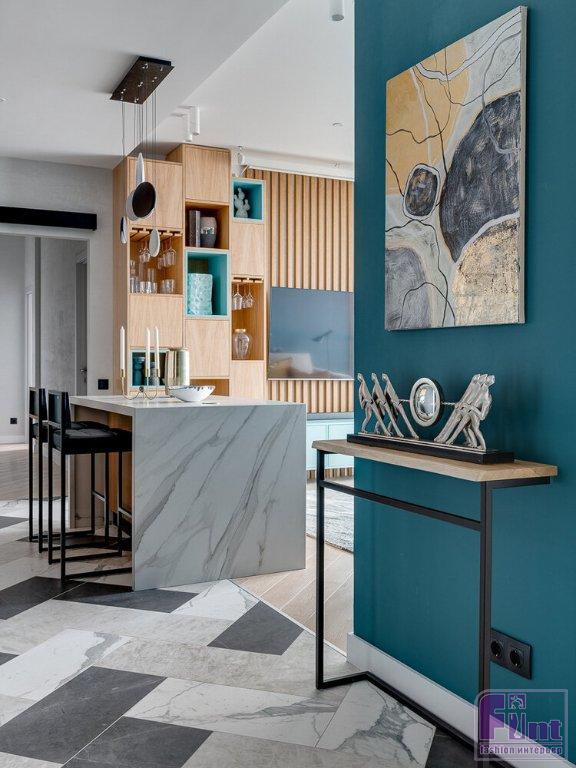 Материалы подобраны так, чтобы подчеркнуть красоту натуральных текстур: камня, дерева. На полу во всей квартире использовали инженерную дубовую доску светлого оттенка. В основном помещении, коридоре и прихожей большая площадь стен отделана декоративной штукатуркой, а также матовой краской насыщенного цвета морской волны. Насыщенный темный цвет морской волны на стене в сочетании со свежим бирюзовым оттенком в мебели на фоне нейтрального серого оттенка стен хорошо разбавляют яркие золотистые акценты в мебели, светильниках и текстиле. Цветовая палитра навеяна ассоциациями с океаном и солнцем.