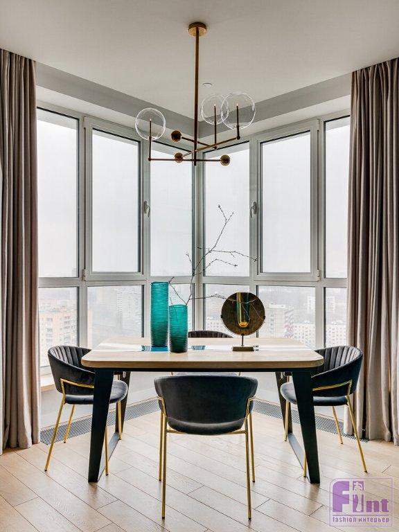 В гостиной есть возможность смотреть не только телевизор, но и кино на экране проектора, который в нужный момент опускается с потолка и закрывает телевизор. В самой светлой эркерной зоне с низкими подоконниками и видом на Москву расположился обеденный стол. Подоконник отделан дубом, его можно использовать как лавку, и любоваться городом. Особую роль играет чёрный цвет, присутствующий практически в каждом элементе интерьера: мебели, отделке, светильниках, стеклянных перегородках, радиаторе. Он собирает весь интерьер в единое целое и добавляет ему графичность и особую выразительность.