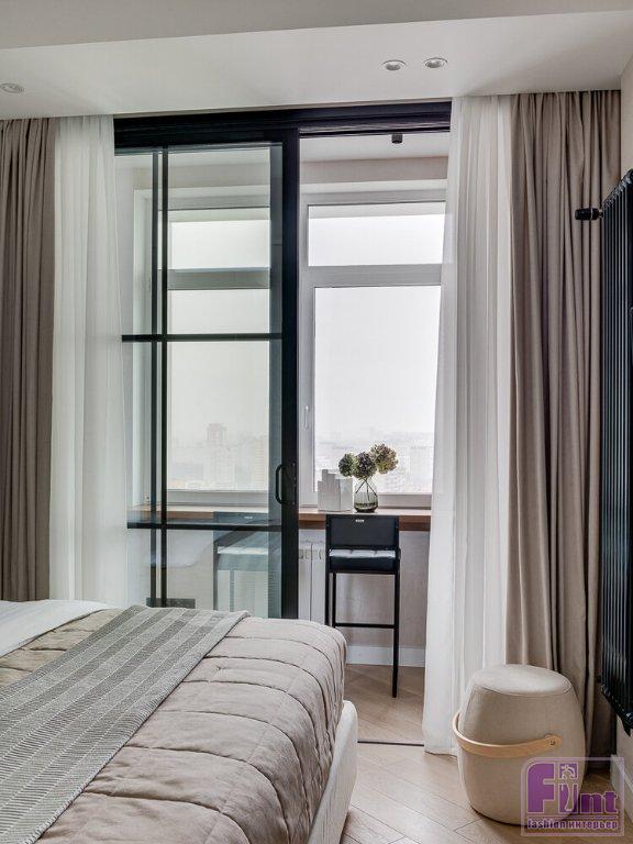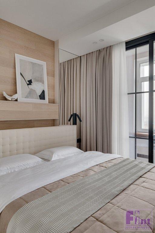 В мастер-спальне изначально не было балкона, его создали намеренно, по просьбе заказчика, отделив одну зону от другой с помощью стеклянных перегородок. За счёт зеркал по бокам кровати удалось увеличить пространство комнаты, впустив больше света.