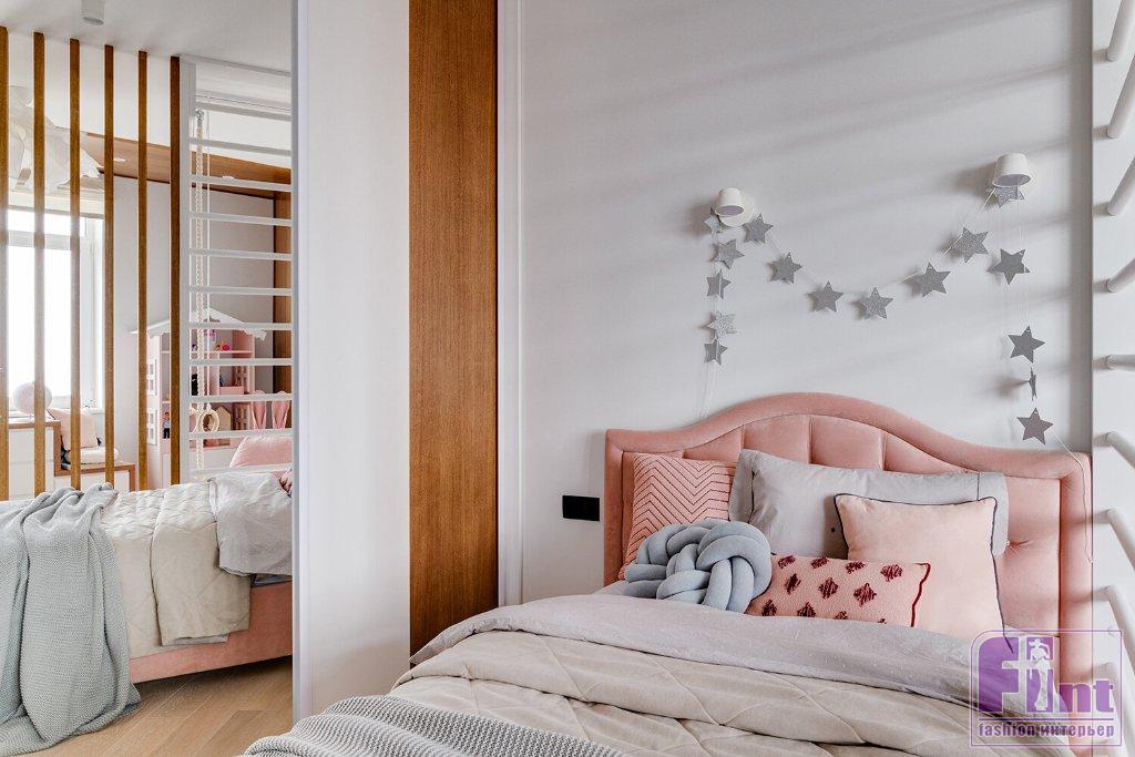 Детская имеет сложную трапециевидную форму за счёт внешних стен в плане. «Пришлось перебрать много вариантов планировочного решения, пока мы не добились идеального результата. Заказчики уже имели опыт ремонта, и в предыдущей квартире им не хватило сил и фантазии доделать детскую. Поэтому в этот раз было важно продумать всё до мелочей. Нам удалось разместить все необходимые зоны: зону хранения со встроенным шкафом, спальную зону, спортивную зону с детской стенкой, отделенной от спальной зоны с помощью вертикальных МДФ-реек. Игровая с кукольным домиком расположилась в скошенном углу комнаты. Рядом, вдоль окна организовали стол со встроенными полками для хранения учебных принадлежностей. В спорт-зоне на стене детский скалодром», — рассказывает автор проекта.