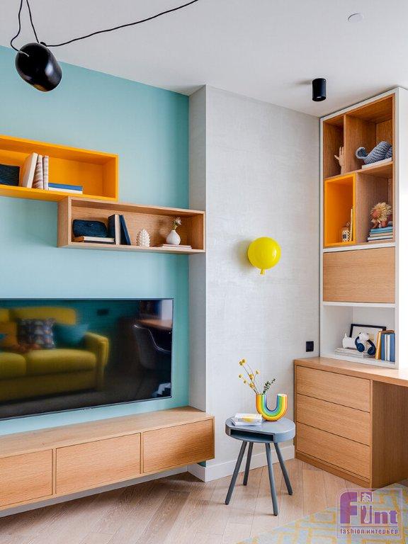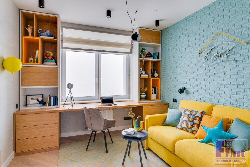 Кабинет/гостевая — будущая вторая детская. Тематика бирюзово-мятных оттенков на стенах в сочетании с золотыми солнечными акцентами продолжается и в этой комнате.