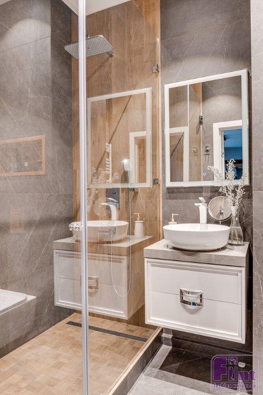 За счет переноса дверного проема по центру стены удалось организовать две зоны в санузле: с одной стороны — ванная, с другой — душевая в строительном исполнении. В санузле использовали керамогранит под мрамор и под дерево. В каждой комнате, а также прихожей, имеются встроенные шкафы для одежды. Системы хранения преимущественно закрытые, но с использованием открытых полок для книг и декора. Вся корпусная мебель изготовлена на заказ, в шпоне или эмали. Также имеется отдельная постирочная комната.