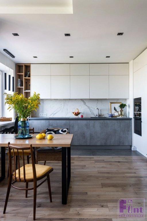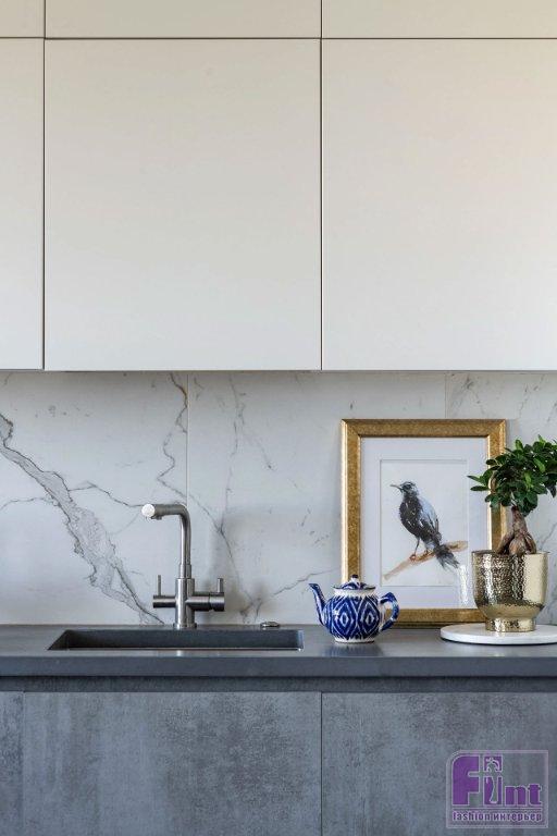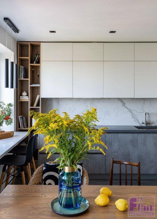 Кухонный гарнитур хотели видеть менее утилитарным, так как помещение объединено с гостиной. Для этого выбрали светлый цвет для верхних шкафов, их сделали под потолок, что как будто растворяет их в пространстве. Встроенные колонны с техникой также светлого цвета. Нижние шкафчики — в цвет керамогранитного пола, а столешница из архитектурного бетона (находка дизайнера — достаточно бюджетный, но натуральный и практичный материал) не выбивается из образа. Меньшей утилитарности мебели придают ещё и открытые полки для книг и декора, которыми продолжили гарнитур.