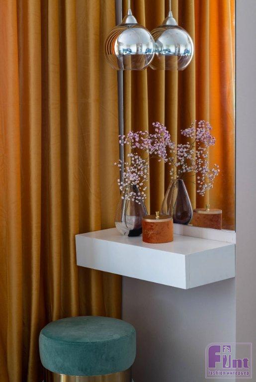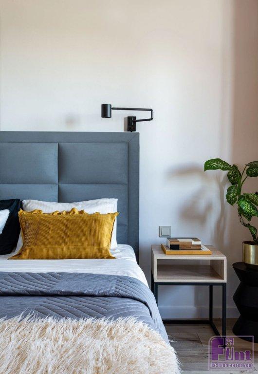 Сценарии освещения разделены на общие и дополнительные, местные. Общие решены встроенными и накладными светильниками. В кухне-гостиной они графичного чёрного цвета, а в спальне — светлые, в цвет потолка. Дополнительные сценарии реализовали по необходимости — настольные лампы, бра, подвесы. Интересная история связана со светильником с большим полукруглым абажуром ярко-жёлтого цвета, который стоит на ТВ-тумбе. Это лампа Estoplast 80-х годов. Хозяева нашли её на чердаке старой дачи. И, конечно же, дали новую жизнь!