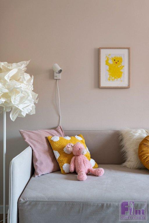 В отделке использовали практичные материалы, совмещали бюджет и эстетику. На стенах обои под покраску. В жилых зонах — ламинат под дерево. «Он имеет цвет натурального дерева и интересный рисунок, имитирующий разноразмерные плашки дерева, что делает его похожим на паркет и придаёт динамичности. Конечно, мы бы хотели использовать натуральный пол, но в условиях бюджета выбрали более экономичное покрытие с имитацией», — комментирует Алёна.