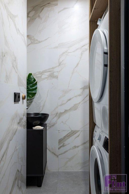 Застройщик предлагал три изолированные комнаты, отдельную кухню, ванную, санузел и вытянутую гардеробную. Дизайнер представила хозяевам план перепланировки, который сделал квартиру ещё удобнее. Так, согласно дизайн-проекту, гостиную с кухней объединили и там же выделили одно рабочее место (оно принадлежит хозяину квартиры). Два санузла оставили раздельными, в одном — полноценная ванная с унитазом, в другом, кроме унитаза, удалось уместить постирочную зону. В вытянутой гардеробной решили выделить второе рабочее место.