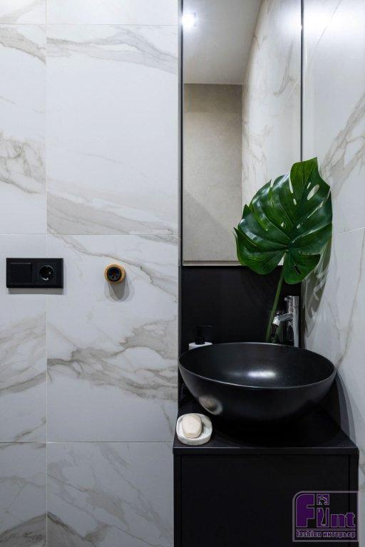 Керамогранит использовали в отделке пола в прихожей, рядом с кухонным гарнитуром и в санузлах (в последних ещё и на стенах). Потолок подшили гипсокартоном и покрасили — на этом экономить не стали, сделали выбор в пользу экологичности материала. Но в санузлах — натяжное полотно, так практичнее (натяжной потолок провисает в случае затопления по вине соседей сверху, с него легко слить воду, а отделка и мебель не страдает).