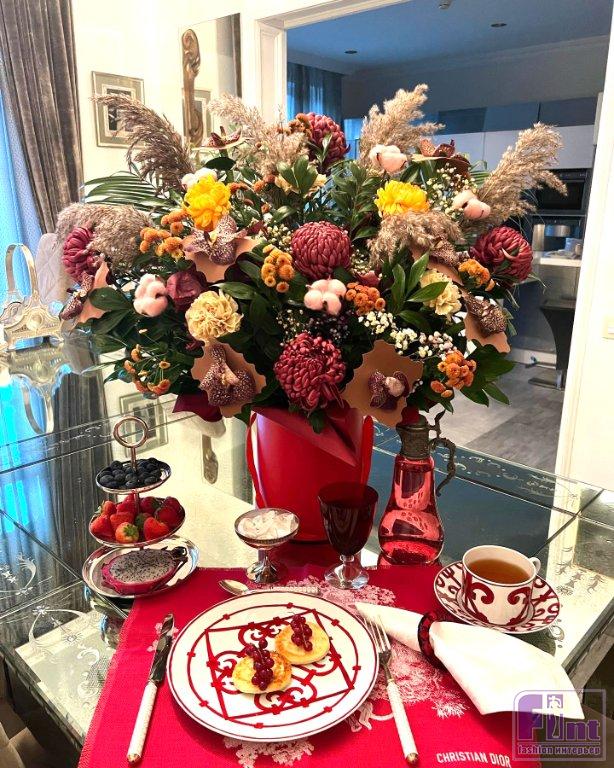 Звёздный продюсер и супруга Евгения Плющенко пока ещё не поставила настоящую ёлку в своём роскошном доме, но уже сменила традиционный букет на обеденном столе, установив на нём шикарную цветочную композицию в новогоднем стиле. Подобно новогодней ёлке этот букет украшен стильными керамическими «игрушками», лежащими на кожаных фигурных «блюдцах» в виде листиков традиционной рождественской омелы. Новогоднего настроения натюрморту добавляет салфетка от Christian Dior, выполненная в традиционной новогодней цветовой гамме, и красно-белый сервиз.