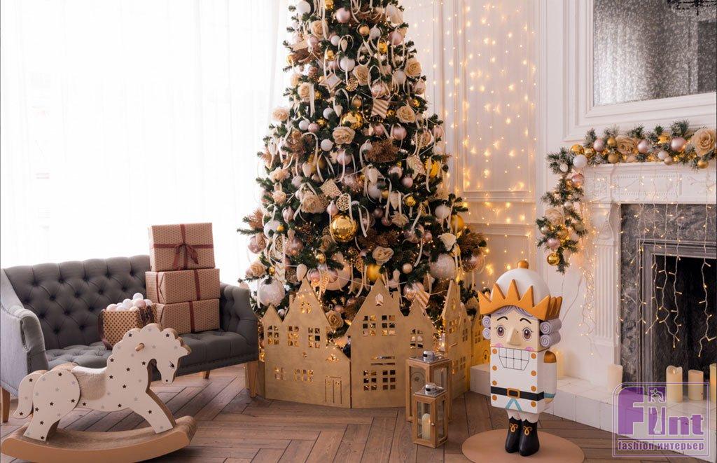 Устойчивая и эстетичная маскировка елки — деревянный ящик или небольшое ограждение без днища высотой до нижних веток ели. Сделать такое несложно самому, например, из фанеры. Самостоятельное изготовление такого деревянного ограждения имеет свои плюсы. В этом случае размер ящика будет идеально подходить под диаметр ёлки и размер подставки. Для создания гармоничной композиции в дополнение к такой подставке можно использовать деревянные ёлочные игрушки, которые сейчас можно без труда купить, выбрав подходящие украшения из огромного ассортимента новогодних товаров.