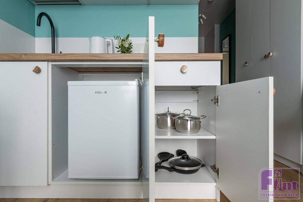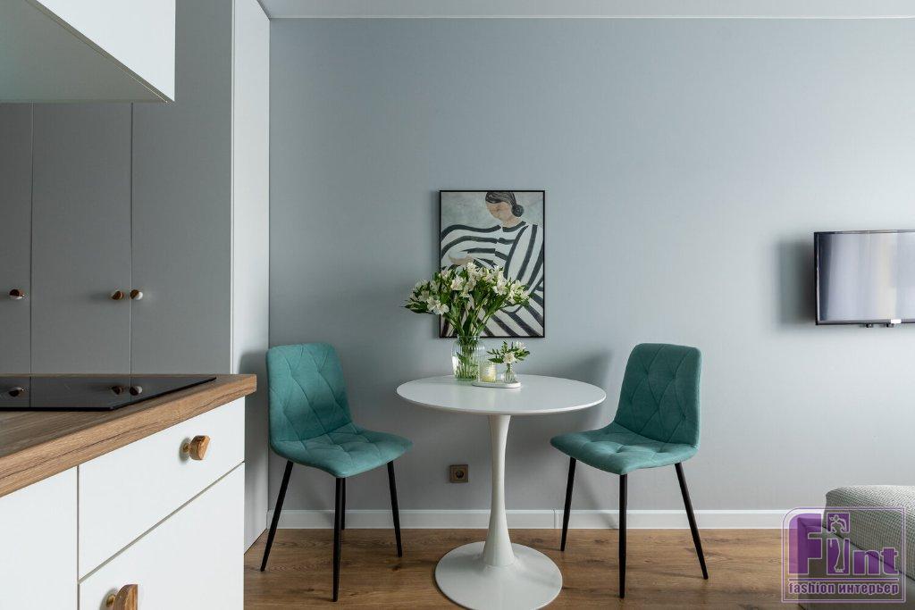 Площадь студии не позволила отделить обеденную зону и зону кухни, но вся бытовая техника размещена за фасадами кухонной мебели, что позволило сделать кухню более лаконичной визуально. Кухня сделана на заказ по скромным габаритам квартиры. Несмотря на небольшой размер, удалось поместить всю необходимую технику для краткосрочного пребывания гостей. В нижнем ряду за фасадом спрятан холодильник, а в верхних — СВЧ. Любимый элемент дизайнера в интерьере — постер у обеденного стола. Заказчица сначала сомневалась в постере, но потом тоже влюбилась в его органичность, и называет эту картину «дамочка».