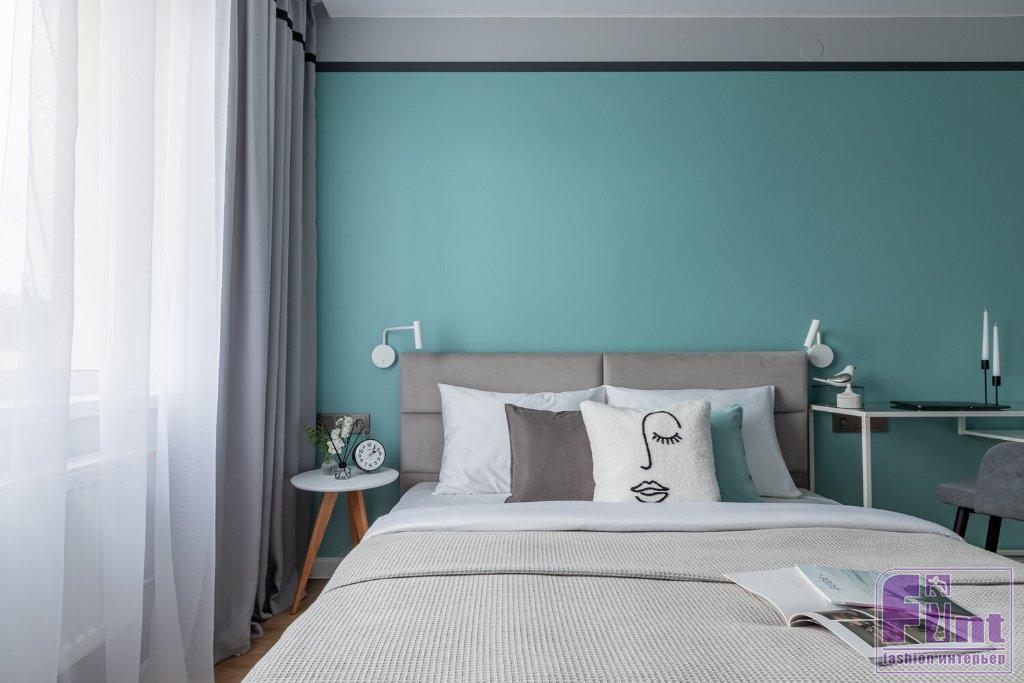 Чтобы визуально расширить скромные габариты квартиры, дизайнер использовала декоративный приём, когда покраска стены «продолжается» на шторах. Для этого на готовые шторы пришили ленту, которая зрительно «вытягивает» пространство, являясь продолжением нарисованной полоски на акцентной стене за изголовьем кровати. Основной тон штор подобран точно под цвет мягкого оттенка серого цвета, который использован для окрашивания узкой полоски акцентной стены и остальных стен в квартире.